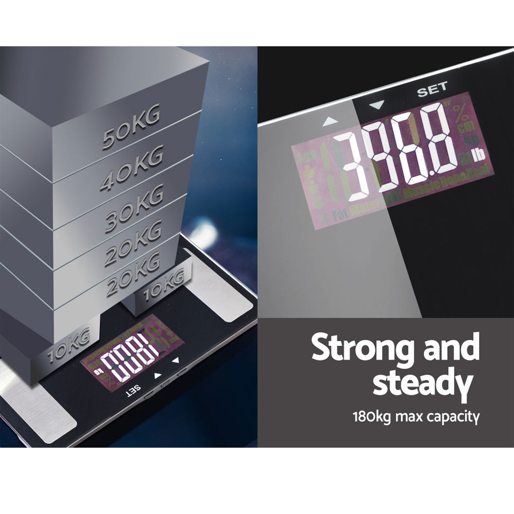 Kicking your fitness goals has just become easier with our Everfit Scale. Equipped with four high-precision sensors, the scale measures 23 unique parameters including weight, BMI, body fat ratio, lean mass, water percentage, muscle mass, bone mass and more, so you can see a complete picture of your health. The scale shows measurements in three units (kg, lb and st-lb) with a weight capacity of 180kg, 400lbs or 28st. The scale has a durable 6mm thick tempered glass platform, and the entire super slim ensemble is only 20mm thick for easy storage and maintenance. To use the scale, just download the Scale Up app onto any iOS or Android phone, open the app and pair the scale to your phone using Bluetooth. The scale will display the results on the large LCD display after each weigh-in and you can store data for up to 99 users. With other great features such as baby scale mode, low power/overload indication and auto on/off, our scale makes keeping track of your health fast and easy.