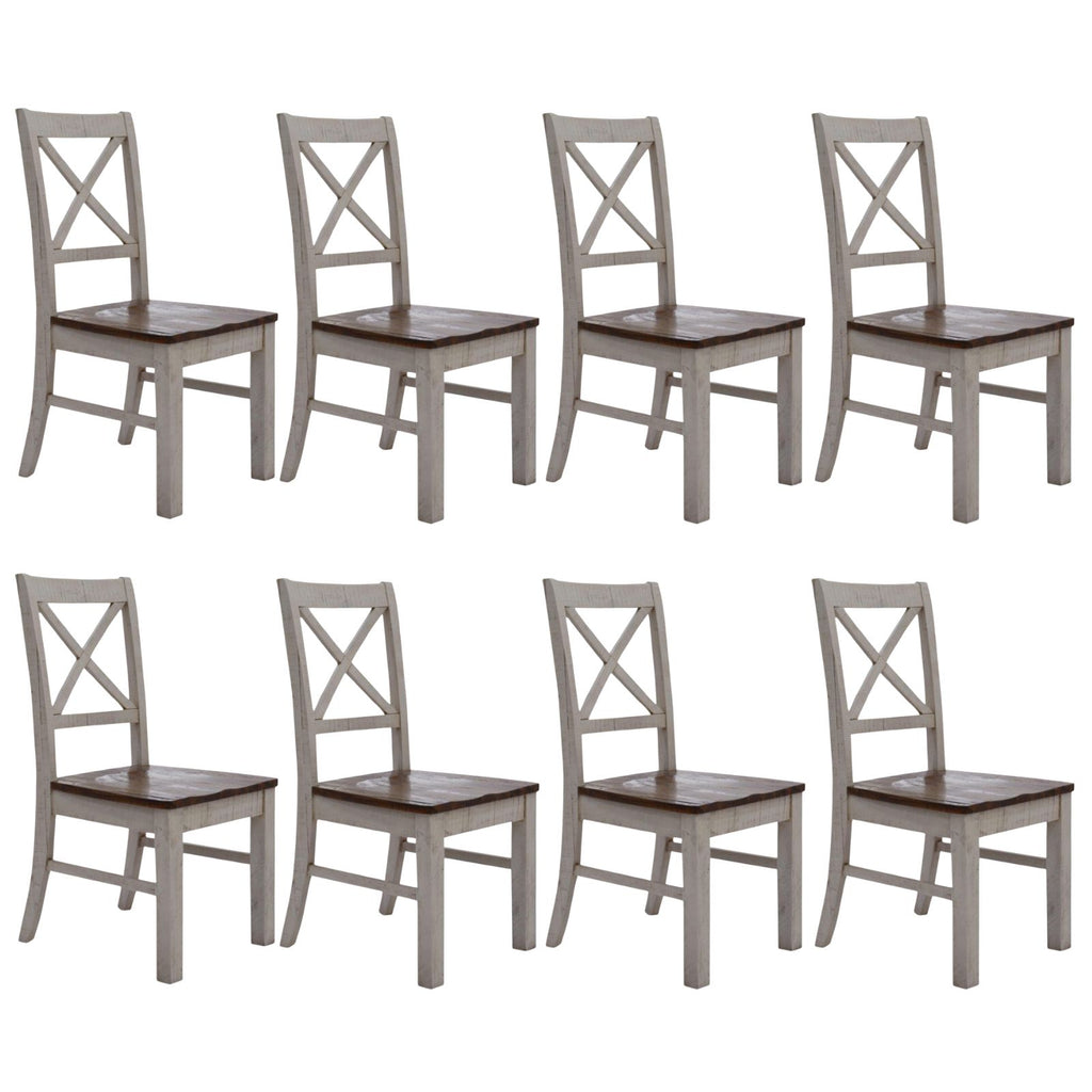 Dining chairs that are well-designed add to the pleasure of eating. To bring this joy to life, fill your dining space with this lovely set of 8 dining chairs with a timber seat. The chair is designed in the Hampton style. When arranged around a dining table, these chairs stand out in any decor setting due to their wooden construction and cross-back design. They are multi-coloured, providing a warm appearance to the living area. The seat is Brown Rustic, and the legs and back are Almond White. The chairs are made of high-quality solid Acacia wood, harvested in a sustainable manner. The wood gives the chairs great strength and durability. The chairs have a one-of-a-kind appearance, with straight, thick front legs and curvy back legs. The fully assembled dining chairs come with a one-year warranty.