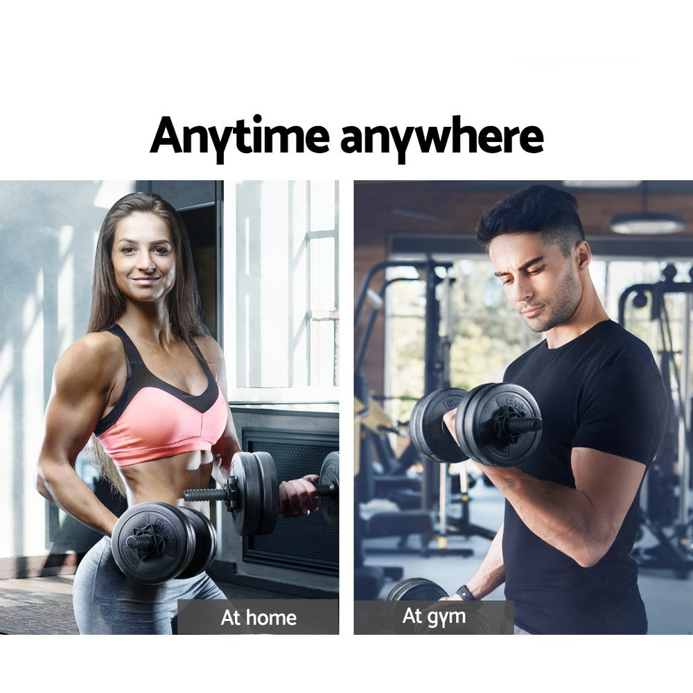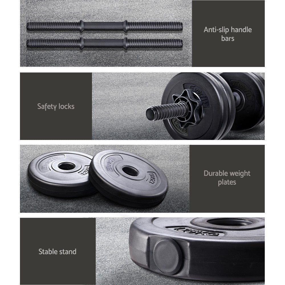 Time to get tough. And our Everfit 12kg Dumbbell Set is the right deal if you are looking to boost those triceps, biceps and shoulders. Or lose some unwelcome fat. Whatever is your game, our dumbbell set lets you strengthen and tone those muscles in pleasing style. The commercial-grade dumbbell features a high-quality bar with non-slip handle that offers optimal gripping surface. Each weight plate weighs 1.25kg and is made of cast cement that is coated with smooth plastic, reducing clanging sounds and making it floor-friendly. You can adjust the weight of the dumbbell by removing the weight plate and only using the dumbbell bar (weighing 1kg each) or adding more compatible weight plates. And the high-quality steel star-shaped nuts ensure the weight plates stay securely in place for safe workouts. Best of all, the dumbbell comes in a set of two (two 6kg dumbbells for 12kg total) so that you can exercise both arms at the same time. Gym junky or workout pro, you can get fit easily with our dumbbell set.