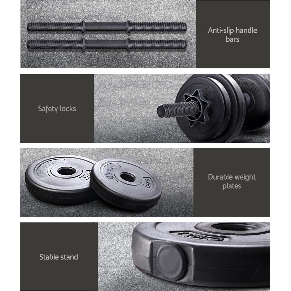 Time to get tough. And our Everfit 17kg Dumbbell Set is the right deal if you are looking to boost those triceps, biceps and shoulders. Or lose some unwelcome fat. Whatever is your game, our dumbbell set lets you strengthen and tone those muscles in pleasing style. The commercial-grade dumbbell features a high-quality bar with non-slip handle that offers optimal gripping surface. Weight plates consist of 1.25kg and 2.5kg pieces, and are made of cast cement coated with smooth plastic, reducing clanging sounds and making them more floor-friendly. You can adjust the weight of the dumbbell by removing the weight plate and only using the dumbbell bar (weighing 1kg each) or adding more compatible weight plates. And the high-quality steel star-shaped nuts ensure the weight plates stay securely in place for safe workouts. Best of all, the dumbbell comes in a set of two (two 8.5kg dumbbells for 17kg total) so that you can exercise both arms at the same time. Gym junky or workout pro, you can get fit easily with our dumbbell set.