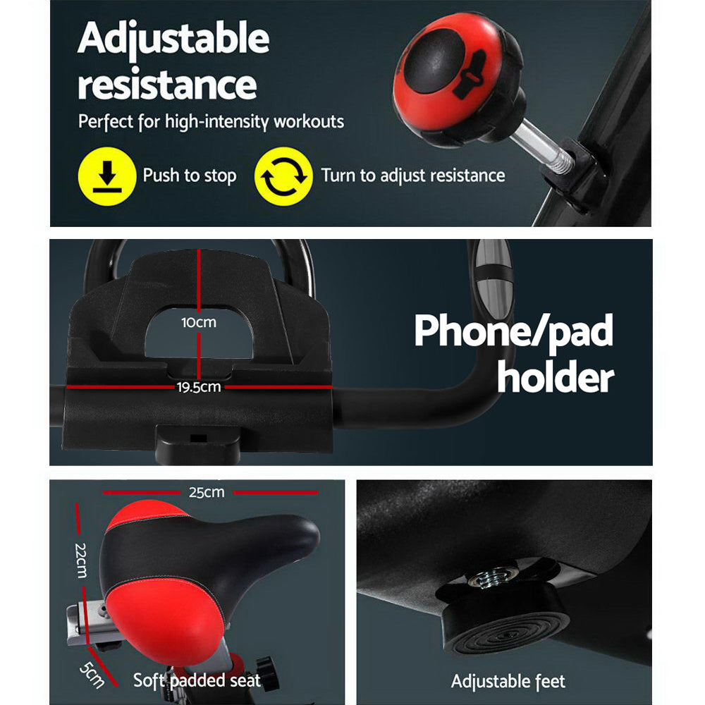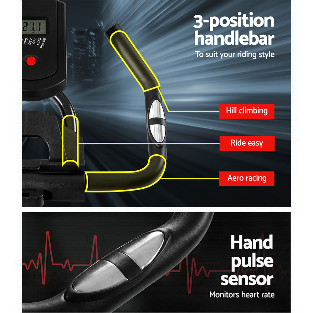 Now, nothing can stop your bike training regimen. Not even bad weather. The Everfit Spin Bike helps to supplement your road biking sessions or lose some weight and get fit in the comfort of your home anytime. With a heavy-duty stainless steel 6kg flywheel and automotive-grade drive belt that delivers plenty of resistance via a control knob, the spin bike offers a smooth and noiseless workout. The frame itself is made of industrial-strength powder-coated steel for durable and robust use. Plus, an onboard computer with an LCD monitor assists in tracing six fitness parameters in one easy operation. The spin bike features an extra thick padded saddle seat that is fully adjustable in height and position. The handlebar is also adjustable to suit your handling comfort. Not least, the spin bike comes with non-slip pedals with straps and built-in transportation wheels for easy mobility.