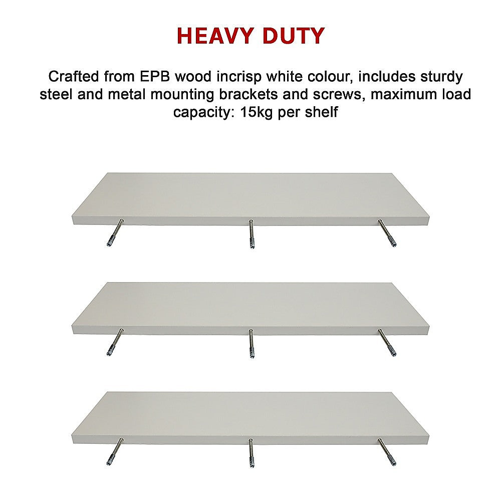 Do you need a streamlined, modern set of shelves to display your collectables and other treasures? This set of three floating wooden wall shelves painted in crisp white from Randy & Travis Machinery is the perfect solution. Crafted from EPB wood and sturdy steel, these shelves are as practical as they are beautiful.