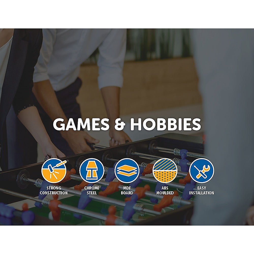 If you and your family love to play foosball, this home-sized table game from Randy & Travis Machinery is the perfect way to bring everyone together. Only four feet in length, this sturdy table features eight ABS-moulded players on each side. Tough chrome-finish steel rods move the players across the board, while built-in pockets on each end collect the balls after you score goals. Anti-slip handles give you perfect control for easier movement.