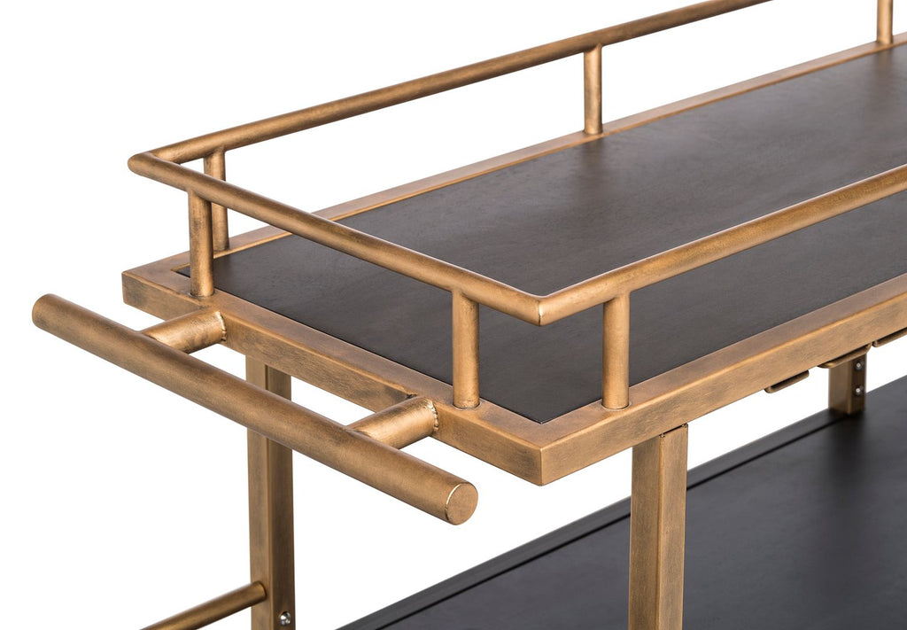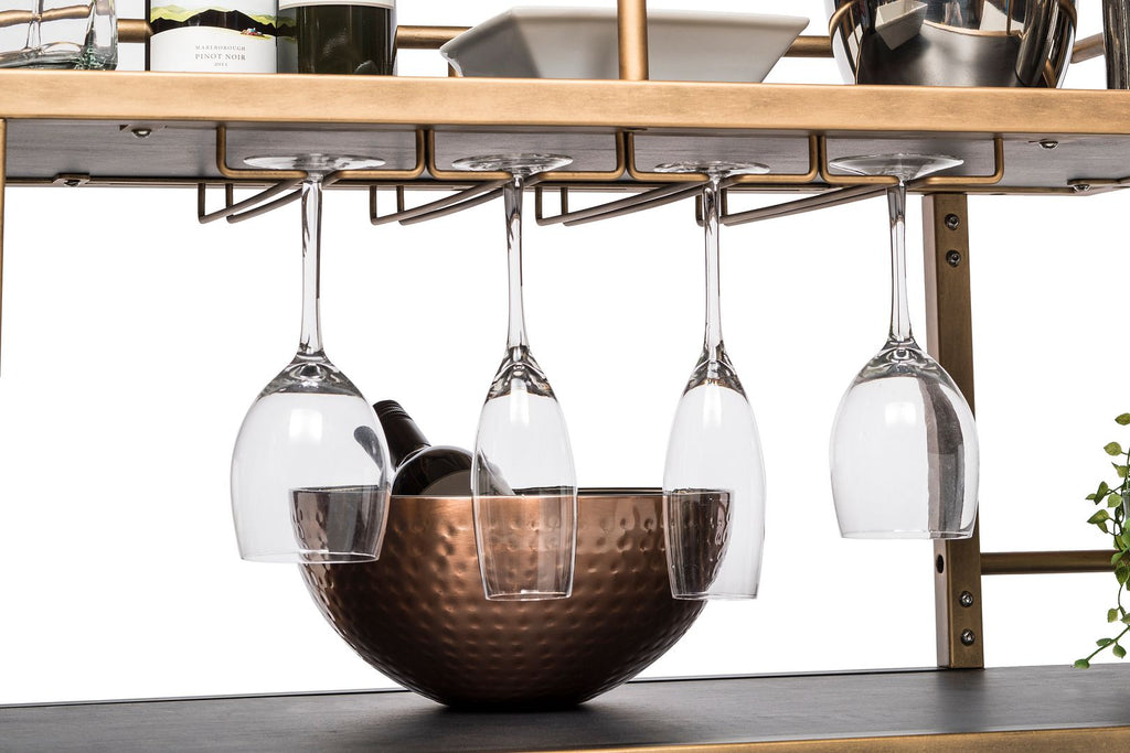 The French Brass and Black Drinks Trolley Bar Cart with Bottle Rack Storage is a true Bar powerhouse featuring a stunning one-of-a-kind design. This Minimalist Bar Cart exquisitely combines a visually appealing richly grained Wood finished in Black with a vibrant French Brass finish on the sturdy Iron frame. With the spacious Multi-Levelled Structure, Dual Wood Shelf Bases and Built-in Stemware and Bottle Racks, you will never run out of space for your favourite Bar and Cocktail essentials. Not only that, with such a flexible design, this item can also be used as a Kitchen Island to store your appliances and dishes – the choice is yours and the options are endless!