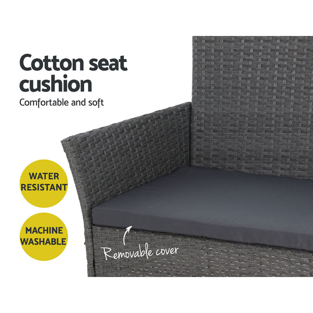 Looking to create a chic and gorgeous outdoor setting? The Gardeon 4-piece rattan outdoor set is a must purchase. It will liven up your outdoor space and help you achieve an elegant space where you can enjoy day and night and summer and winter. The set comprises of two armchairs, a two-seater love seat, and a matching table. Its beautiful and versatile design makes it perfect for indoor and outdoor use. This outdoor set features a lovely rattan weave for a touch of tropical charm, and the UV-resistant PE rattan with galvanised steel frame is suitable for all-season use. The tempered glass tabletop with quality suction pads and solid structure ensures strength and durability. It also has under-table shelf for storage. Our outdoor rattan set also comes with removable cushions that allows you to remove them to suit different seasons, and the polyester covers are easy to keep clean. This rattan outdoor set will withstand the test of time. You can create a praise-worthy spot with just a little creativity that will wow your guests. Shop it for your home today.