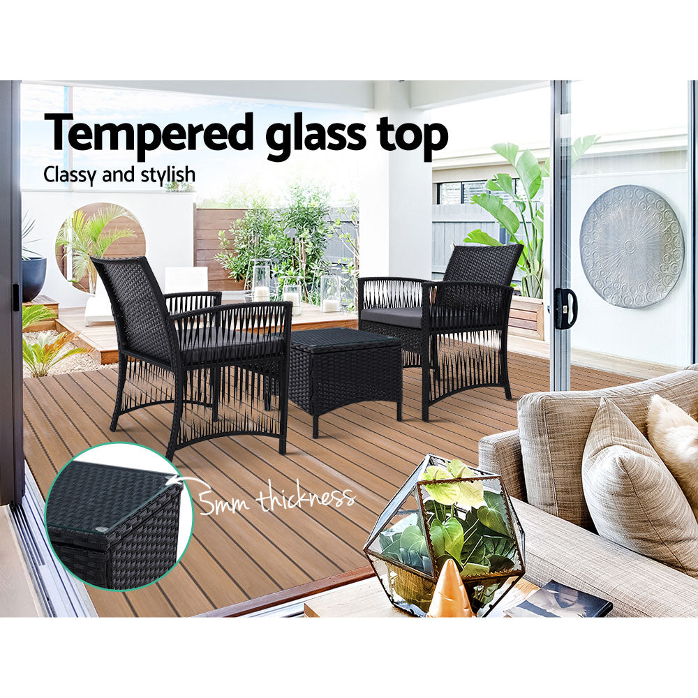 Enjoy the pleasant outdoors or have a nice chat with friends over a cuppa with our Gardeon 3-pc Outdoor Set. With its chic and trendy profile, the set comes with two chairs and a matching table. Finished in meticulously weaved UV-resistant and weather-resistant PE wicker with a strong and sturdy galvanised steel frame construction for both chairs and table, this outdoor set is designed to please as well as stand up to the weather elements. The chairs have an elegant harp-inspired design with 5cm thick high-density foam cushions to ensure comfort and style are always in place. If you spill your drink, the 5mm thick tempered glass tabletop and removable seat cushion covers make cleaning up hassle-free. With so much going for it, the outdoor set certainly deserves its coveted space in your lovely backyard, deck or patio. Or even indoors for a unique presence.