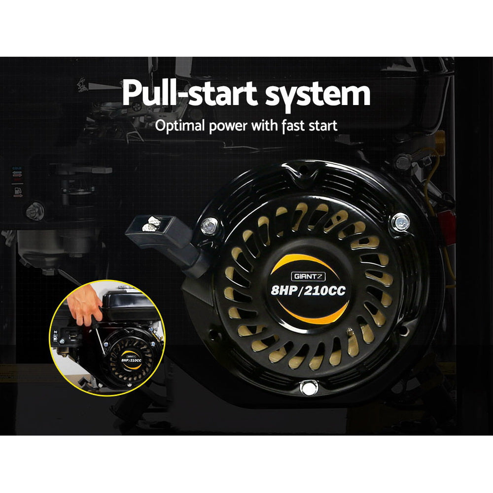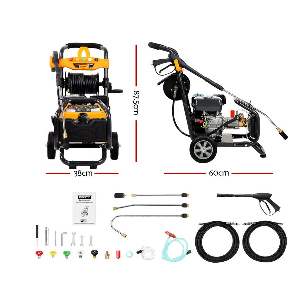 Powerful jets of water for a cleaning experience like no other. The GIANTZ 8hp Pro-series High Pressure Washer makes light work cleaning cars, walls, boats, decks, footpaths, pavements or any other surface of tough dirt and grime in unrivalled performance. With a massive 4800psi coming from its 210cc 3600rpm 4-stroke petrol engine, our washer has a choice of five task-specific nozzles connected to a 30m high pressure hose for jobs ranging from light cleaning to stripping those tough-to-clean concrete pavements. A bonus turbo head is also on hand to blast through the stubborn jobs. Choose from three lances, concrete, gutter or straight, to suit your requirements. Starting up the washer is just a pull start away (no priming needed) and the large pneumatic tyres and protective frame makes it extremely mobile for any application. Its huge 3.6-litre fuel tank also ensures continuous running without unnecessary job interruptions.
