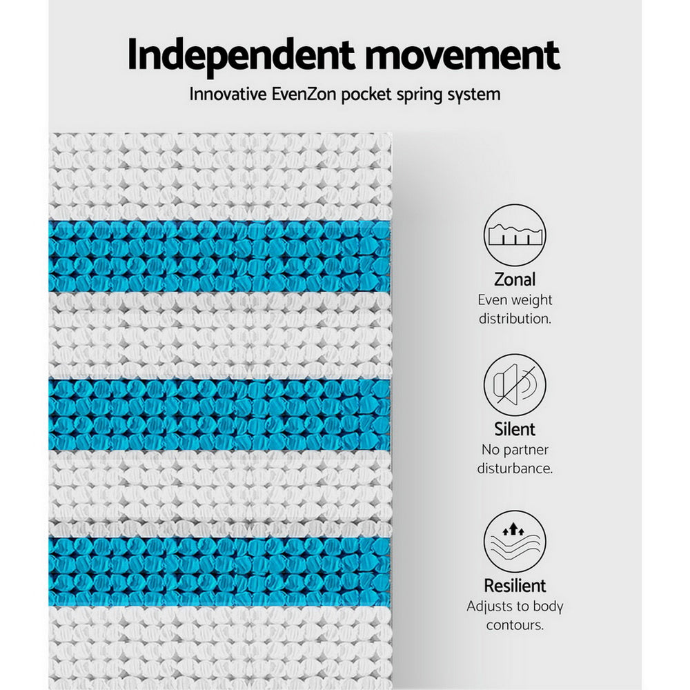 Pamper yourself with our Giselle Bedding Galaxy Series Euro Top Mattress that will give you a soothing sleep night after night. Built upon layers of quality materials, the 35cm thick mattress is a testament to fine craftsmanship and innovative sleep technology. You will find everything you desire for a mattress. Ultra-comfort with its soft and smooth Belgium knitted fabric. Comprehensive support from its genuine 7-zone EvenZon pocket springs system with zero partner disturbance. Quick recovery and rebound with its high-density foam. Temperature control from the gel-infused egg-shaped foam that keeps you cool and ventilated throughout the night. Our mattress delivers all the above with a level of comfort that surpasses expectations and a medium firmness that many Australians love. Not least, the mattress is hygienically constructed to free your body from allergens and dust mites. Better sleep is not just a dream. It is a reality with our luxurious Euro Top mattress.
