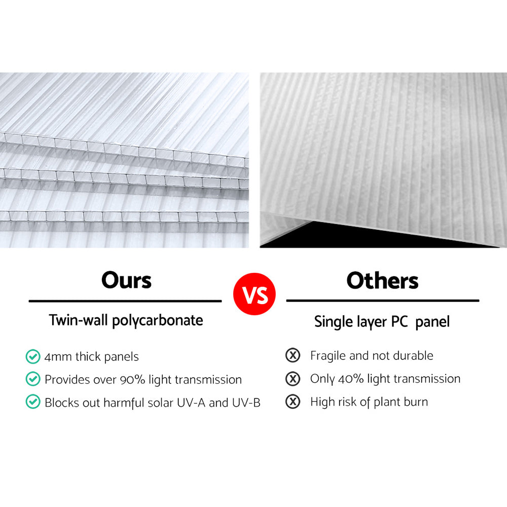 This spacious greenhouse has a massive volume of 17.64m3 and can accommodate a considerable number of plants and vegetables. Covered with 4mm thick twin-wall UV-resistant polycarbonate panels, the Green house allows up to 90% light transmission and helps to eliminate the risk of plant burn effectively. It also has a unique triangular Aluminium framework for enhanced durability and stability, two adjustable roof vents for good air flow and moisture and not least, an effective gutter system for smooth drainage.