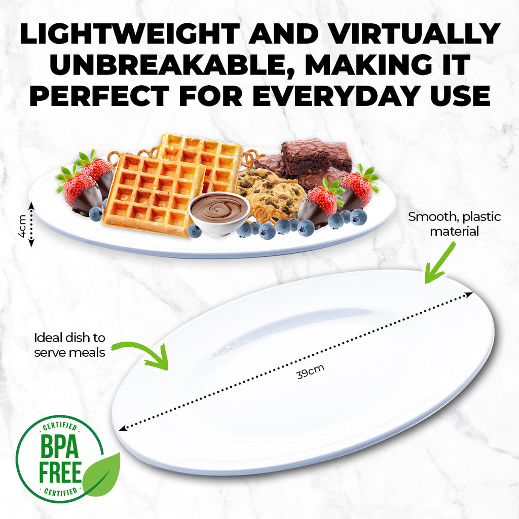 Home Master® These melamine platters are ideal to serve appetizers, entrees, desserts, large meals and more. Resistant to scratches, chips and fading, these platters are lightweight and virtually unbreakable, making them perfect for everyday use.