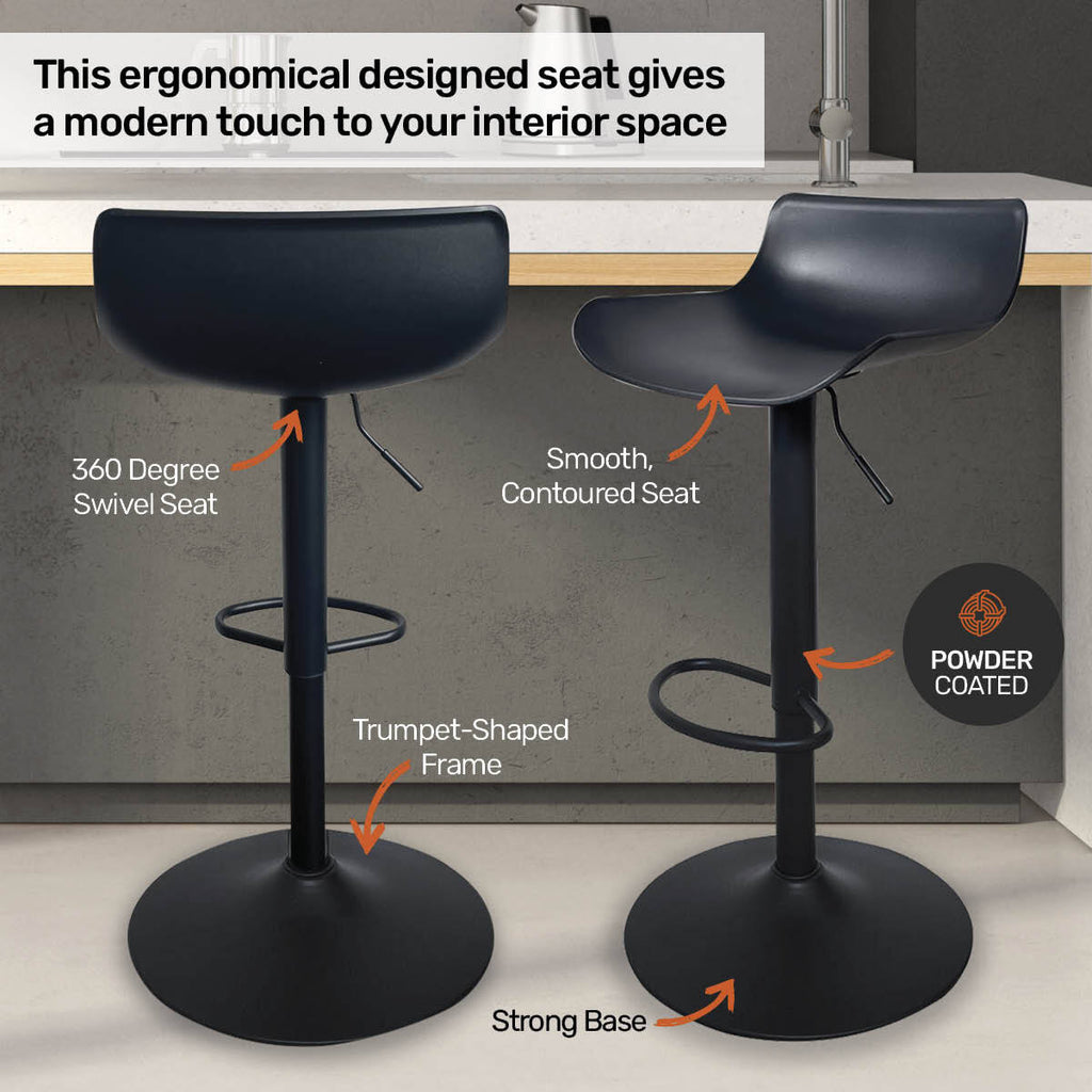 Home Master® These impressive Bar Stools have comfortable PP smooth seating that swivel 360 degrees. Built with a powder coated finish, these stunning bar stools are fitted with easy gas lift mechanisms so there heights are adjustable. Sleek and modern, these stools are sure to compliment any space within your home.