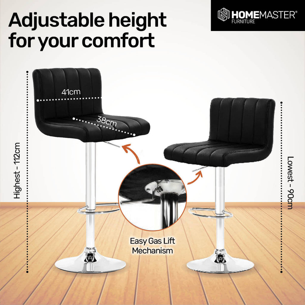 Home Master® These impressive Bar Stools with comfortable backrests swivel 360 degrees. Built with strong chrome bases and frames, these stunning bar stools are fitted with easy gas lift mechanisms so there heights are adjustable. Sleek and modern, these stools are sure to compliment any space within your home.