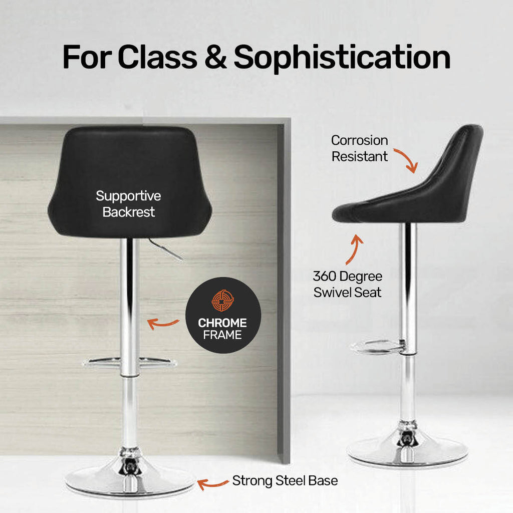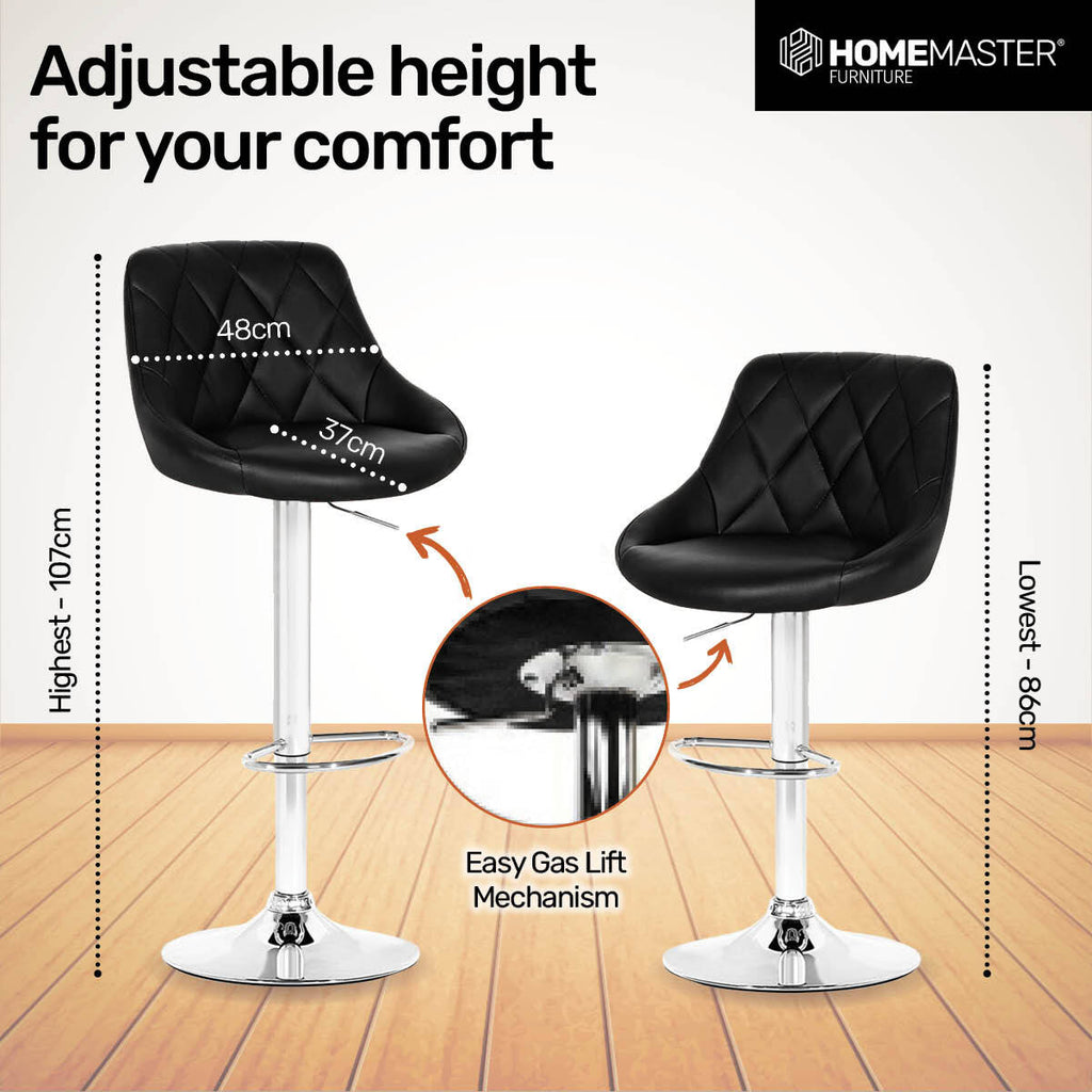 Home Master® These impressive Bar Stools with comfortable backrests swivel 360 degrees. Built with strong chrome bases and frames, these stunning bar stools are fitted with easy gas lift mechanisms so there heights are adjustable. Sleek and modern, these stools are sure to compliment any space within your home.