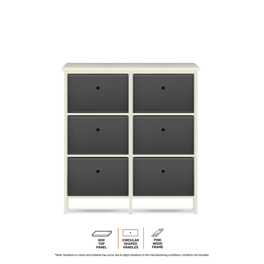 Home Master This stylish and unique storage chest made of sturdy pine wood has spacious fabric drawers. Ideal for bedrooms, office and living areas, this is a versatile storage solution for your home or work environment.