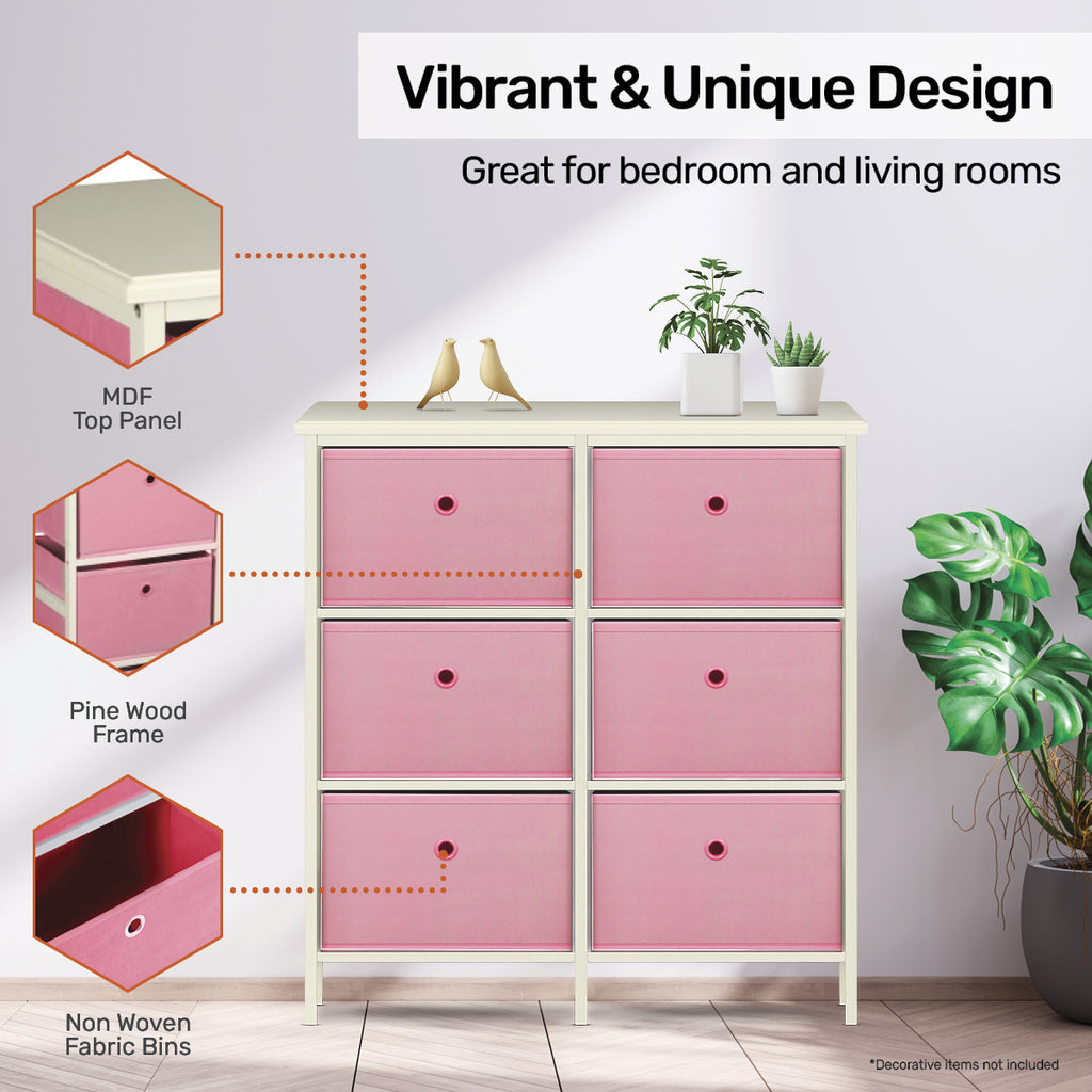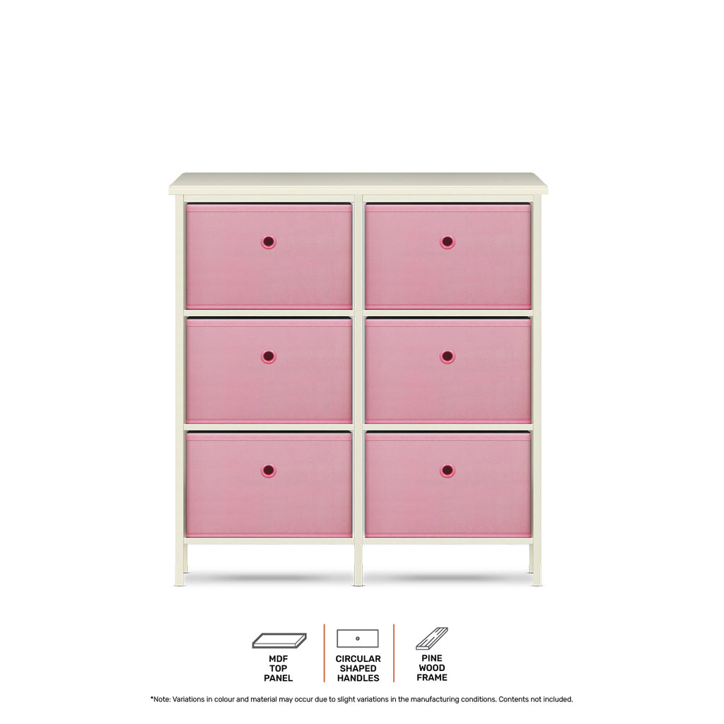Home Master® This vibrant and unique storage chest made of sturdy pine wood has 6 spacious fabric drawers. Ideal for children's bedrooms and living areas, this is a versatile storage solution for your home.