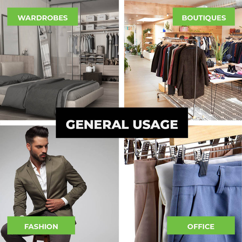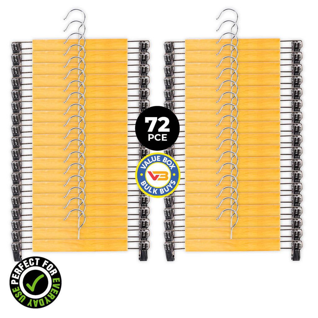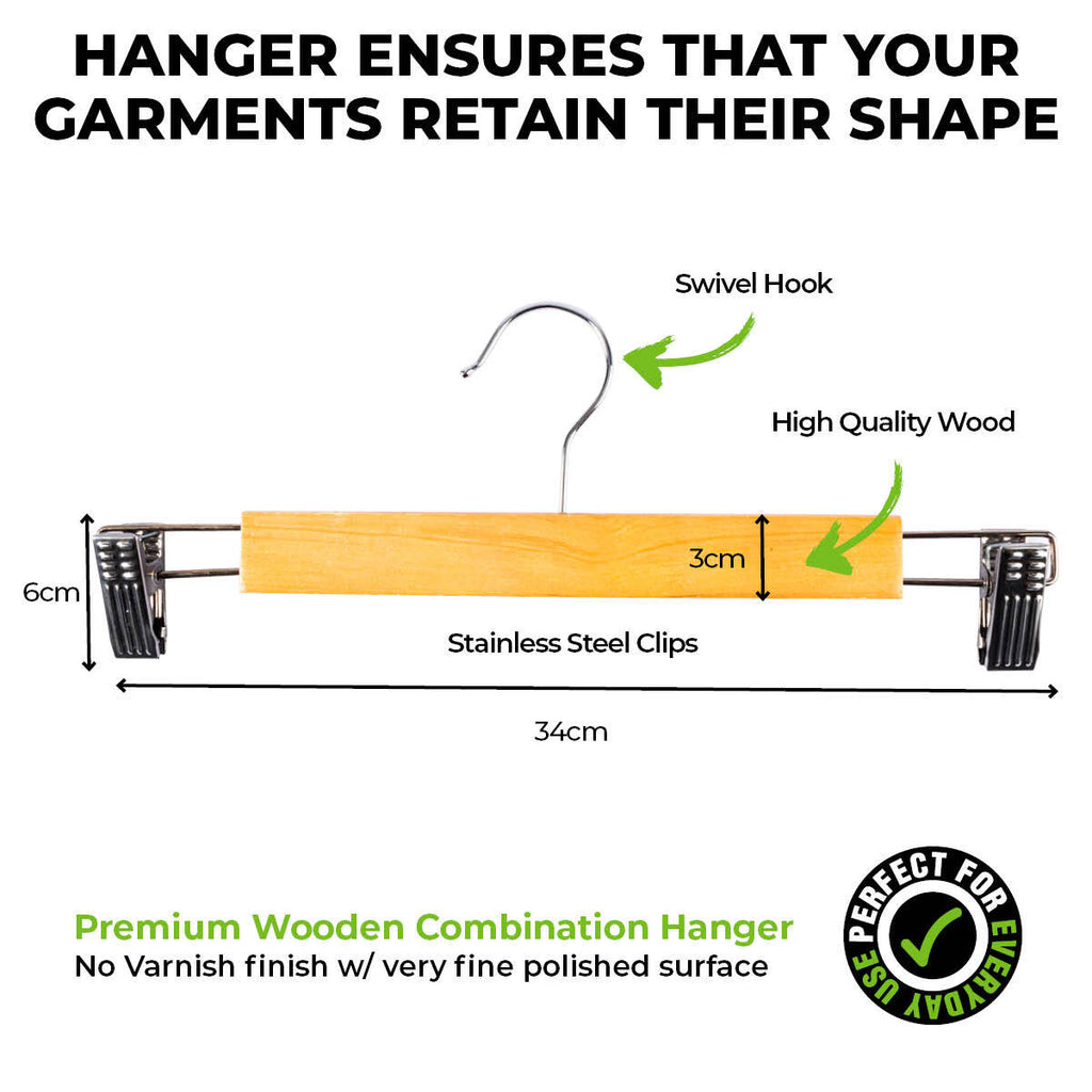 Home Master® Premium quality wooden hangers for all your trousers, pants, skirts and shorts. Fitted with swivel hooks and stainless steel adjustable clips, these will have your wardrobe looking stylish and organised.