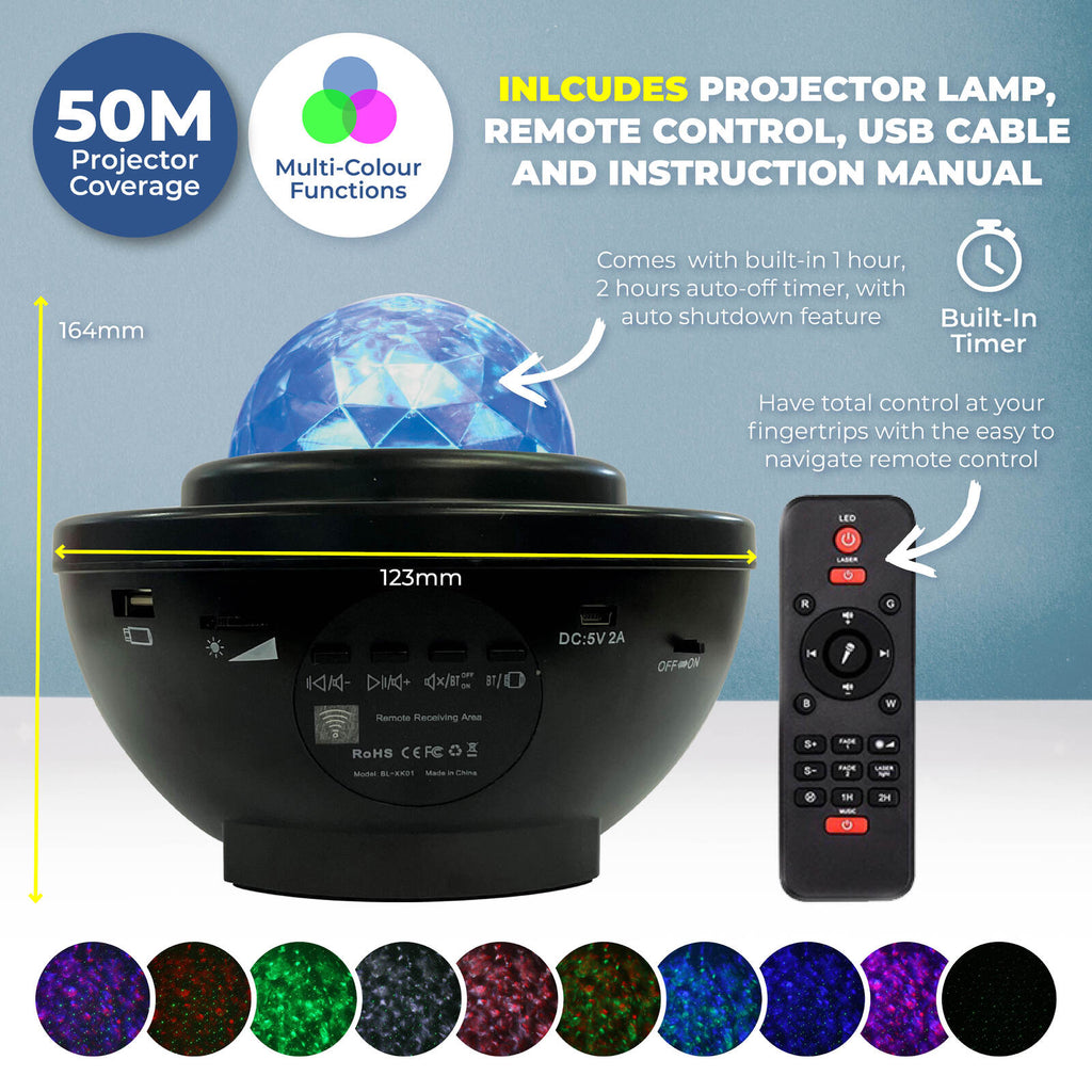 Home Master® This projector lamp displays beautiful, soft and dazzling multi-coloured stars. Offering bluetooth connection, it is remote controlled and can play your favourite music. Use it as a night light to immerse yourself in the stars and relax or use its luminous lighting for celebrations.