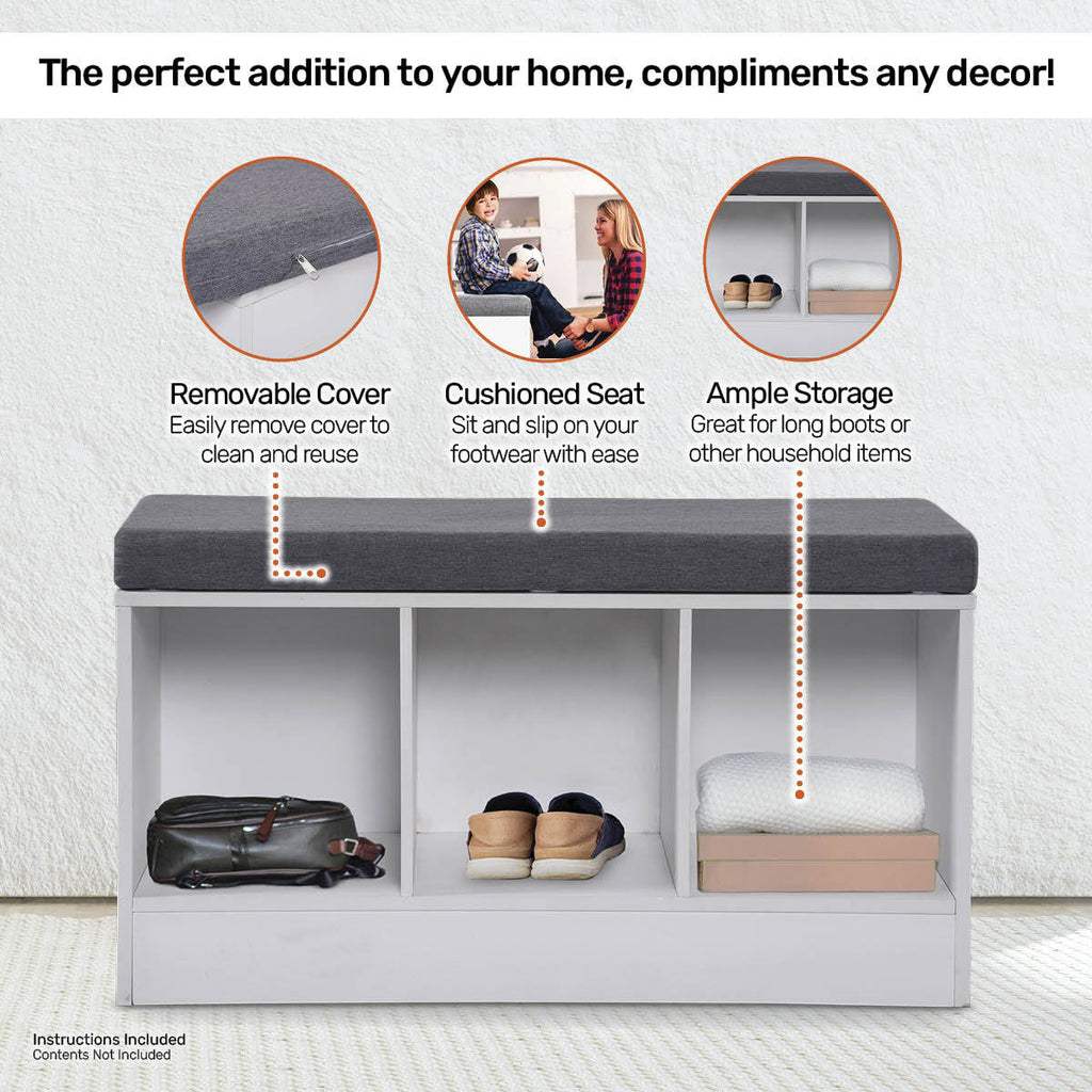 Home Master® A stylishly designed storage bench that is sure to compliment any space. Ideal to display or store items such as; shoes, books, photo albums, decor and more.