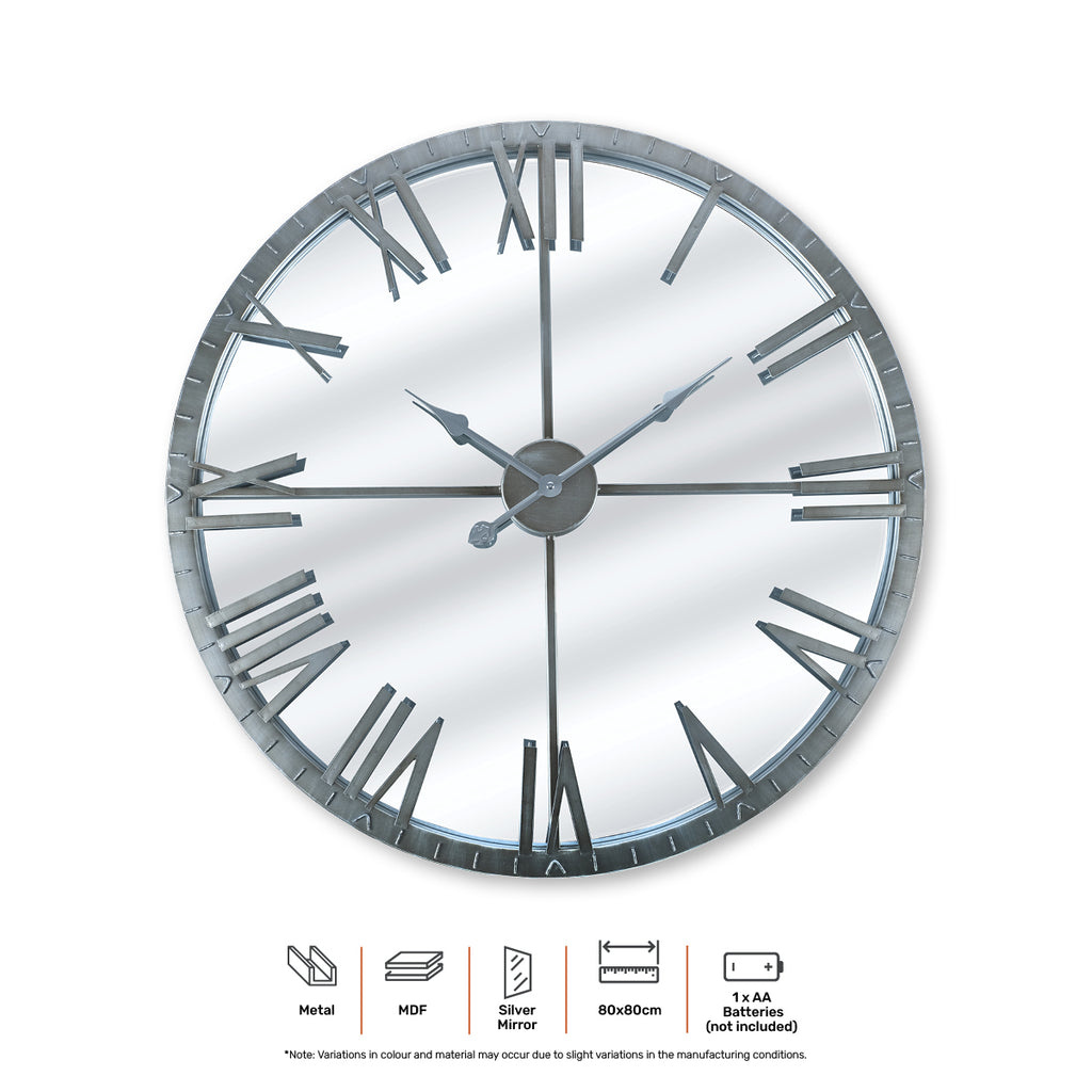 Home Master® This stunning clock with large roman numerals is a beautiful statement piece that will enhance any area within your home. With metal accents and a mirrored surface, this is a stylish clock with timeless appeal.