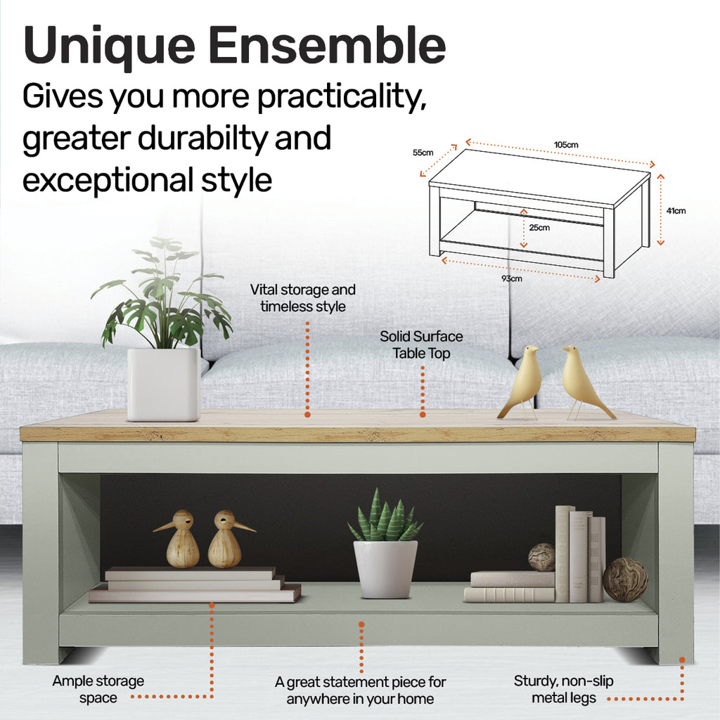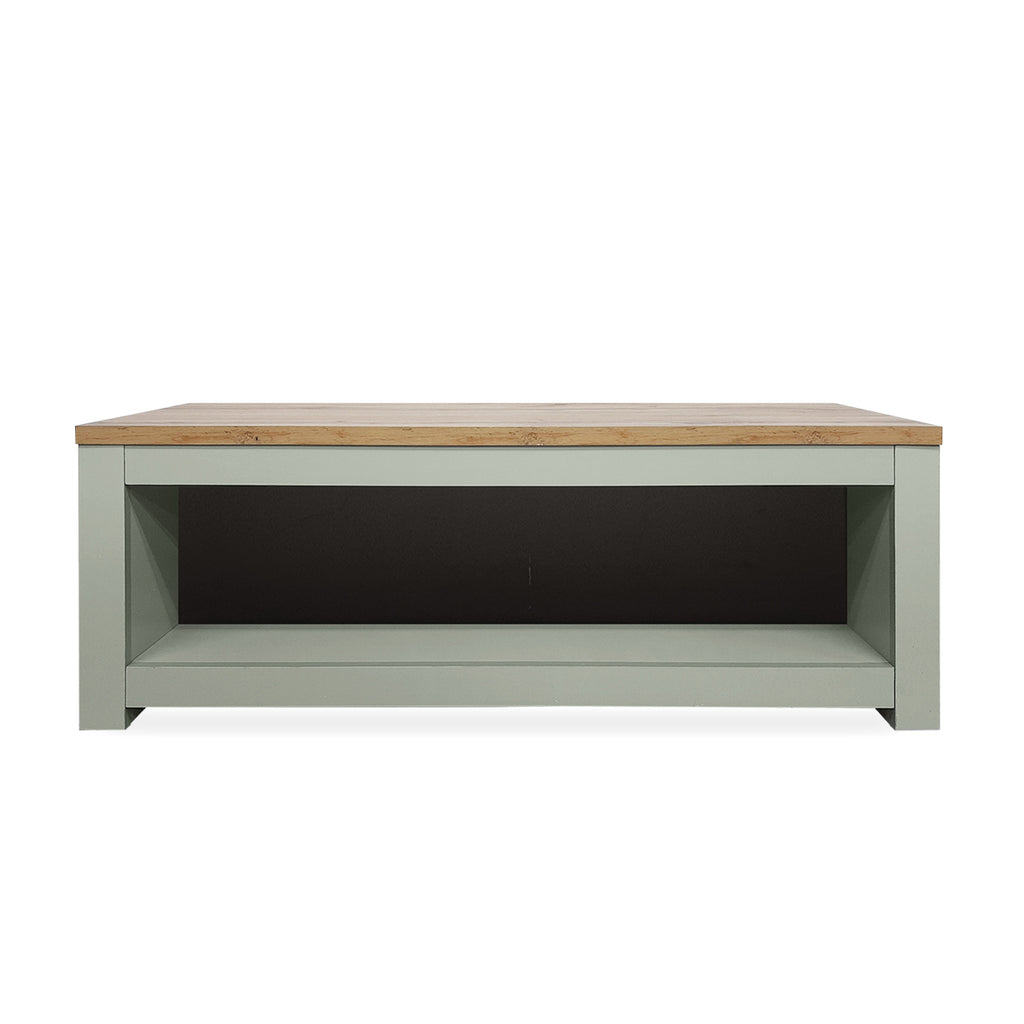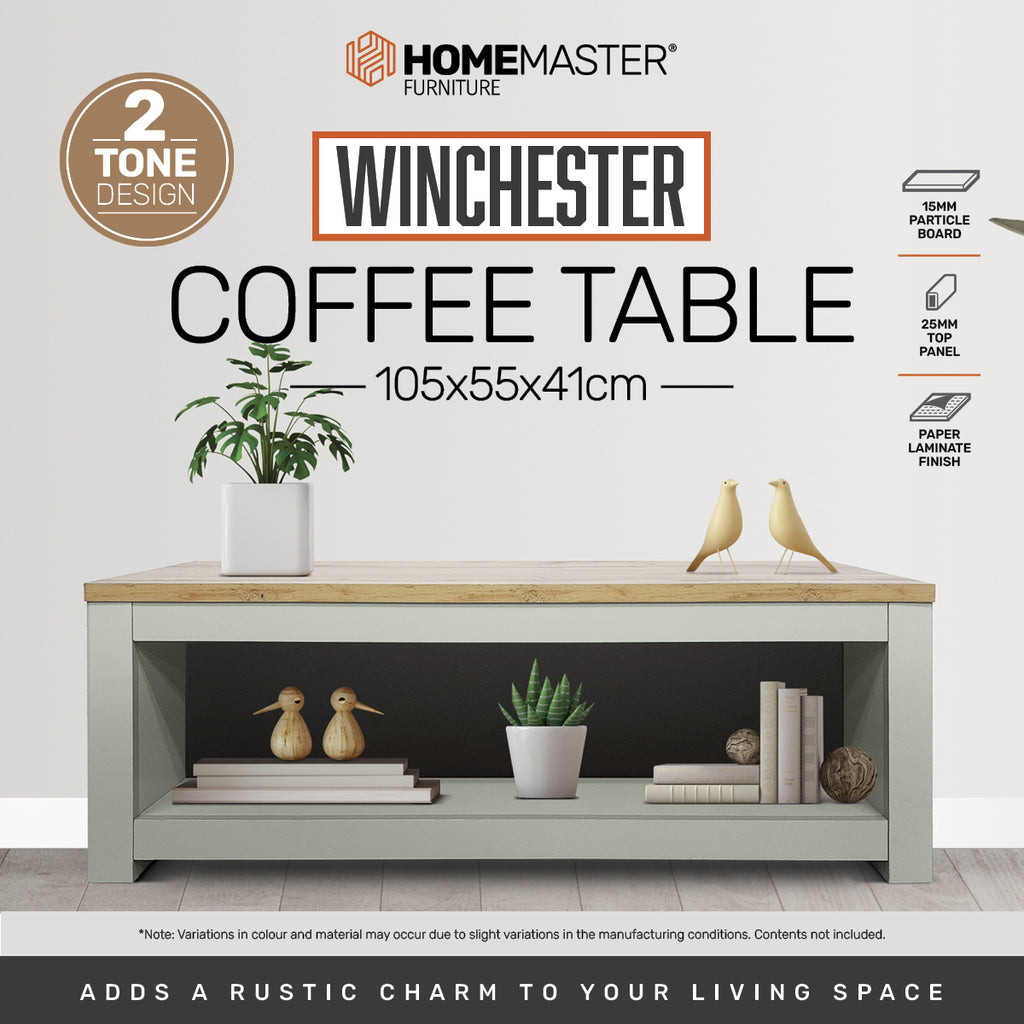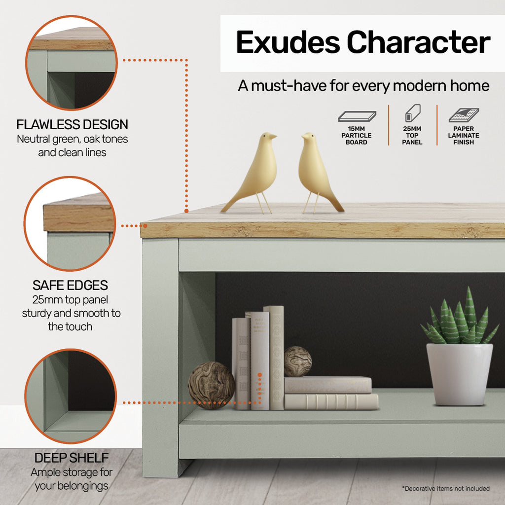 Home Master® With a flawless two tone design of oak and neutral green, this coffee table boasts a spacious mid section. With smooth and sturdy panelling, clean lines and an impressive finish, this is a stylish and timeless coffee table that is sure to compliment your home.