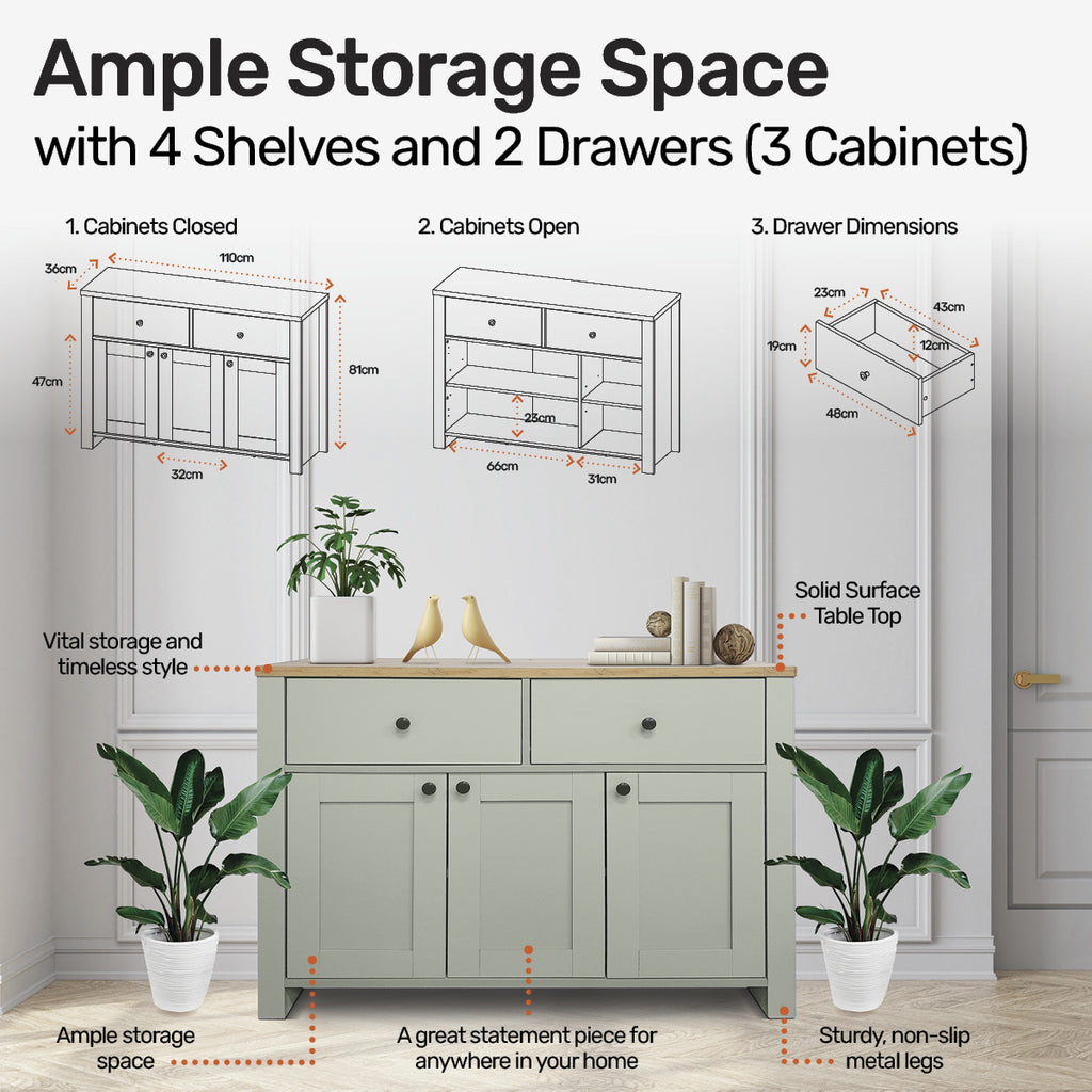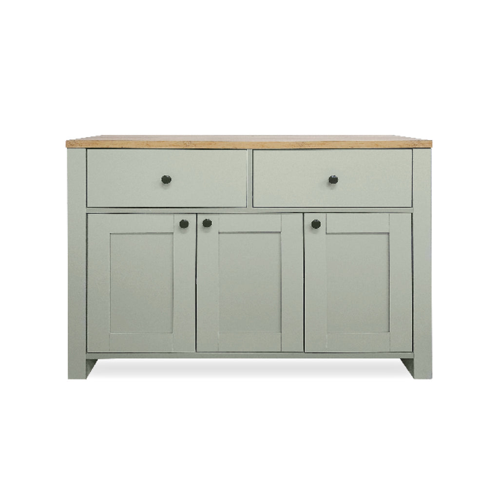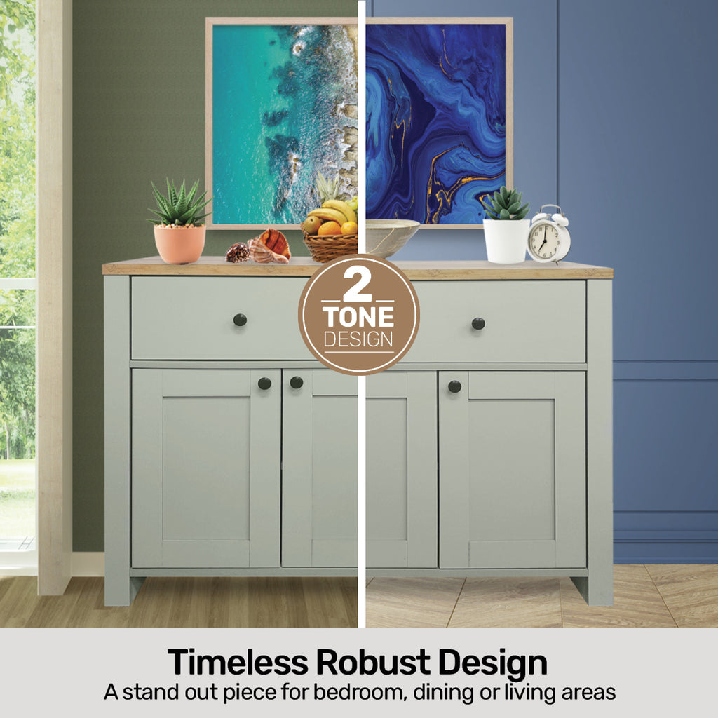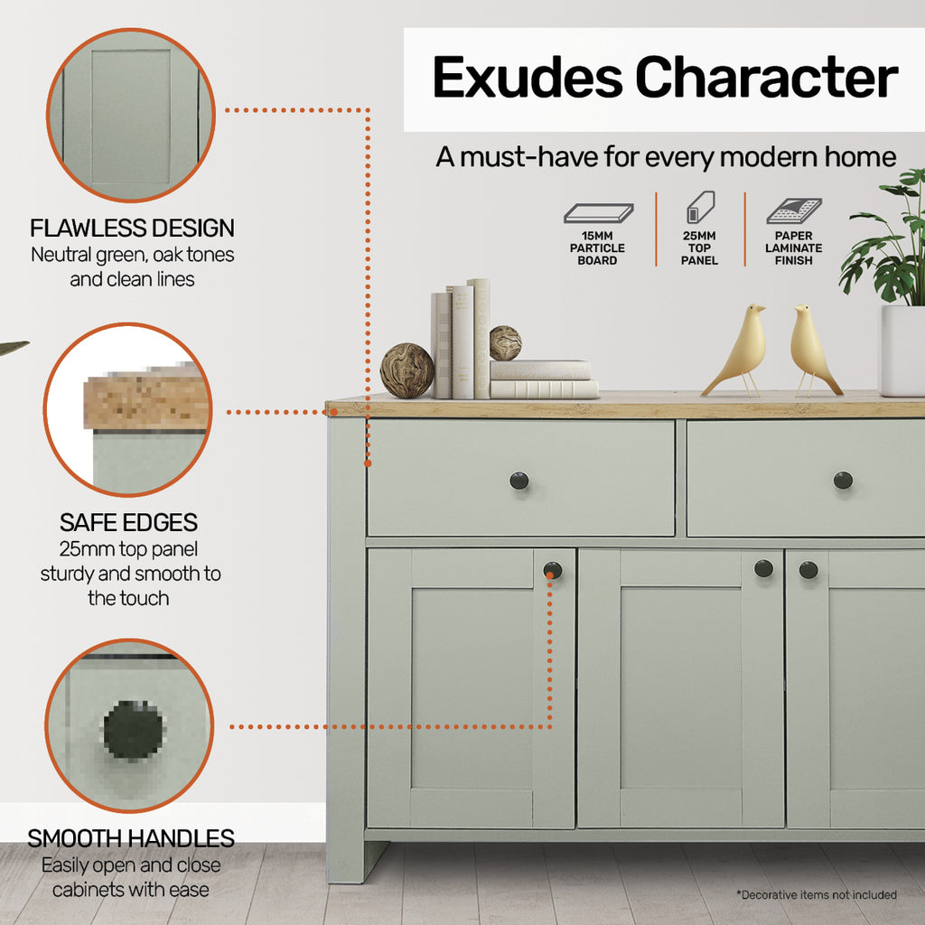 Home Master® With a flawless two tone design of oak and neutral green, this sideboard boasts spacious cabinets and drawers, with smooth and sturdy panelling, clean lines and an impressive finish. A stylish and timeless sideboard that is sure to compliment your home.