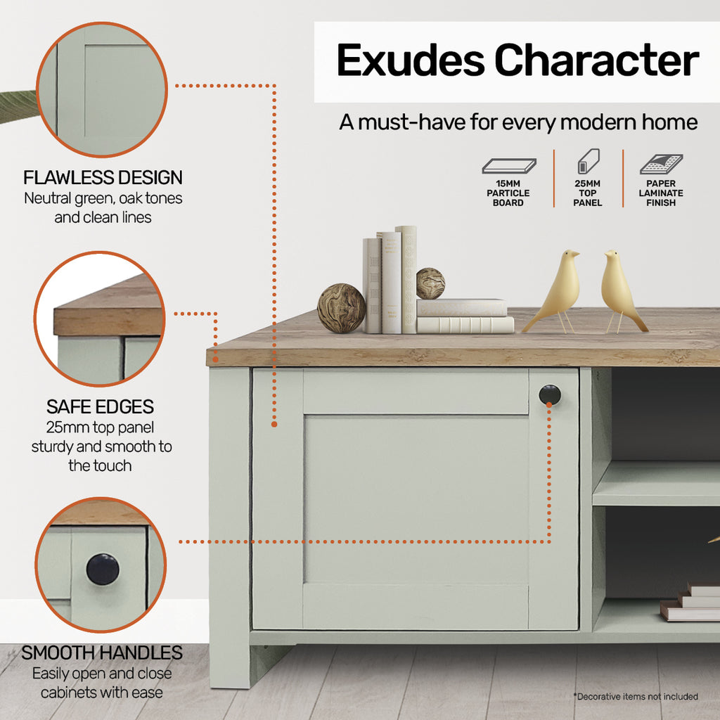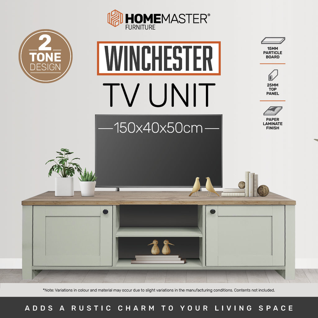 Home Master® With a flawless two tone design of oak and neutral green, this tv unit boasts spacious cabinets, with smooth and sturdy panelling, clean lines and an impressive finish. A stylish and timeless tv unit that is sure to compliment your living area.