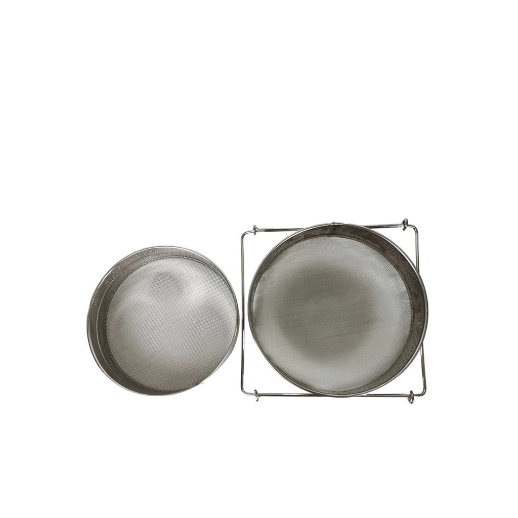 Our strainer features two kinds of mesh, coarse and fine, and allows you to use one or both at the same time. The Coarse strainer is 1000-micron mesh and the fine strainer is a 300-micron mesh. Designed with extendable arms to fit over your bucket, pan or honey tank.