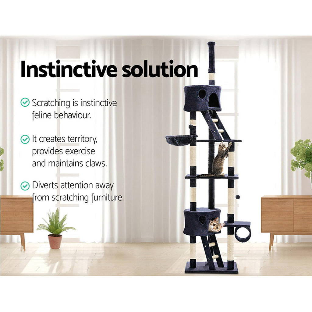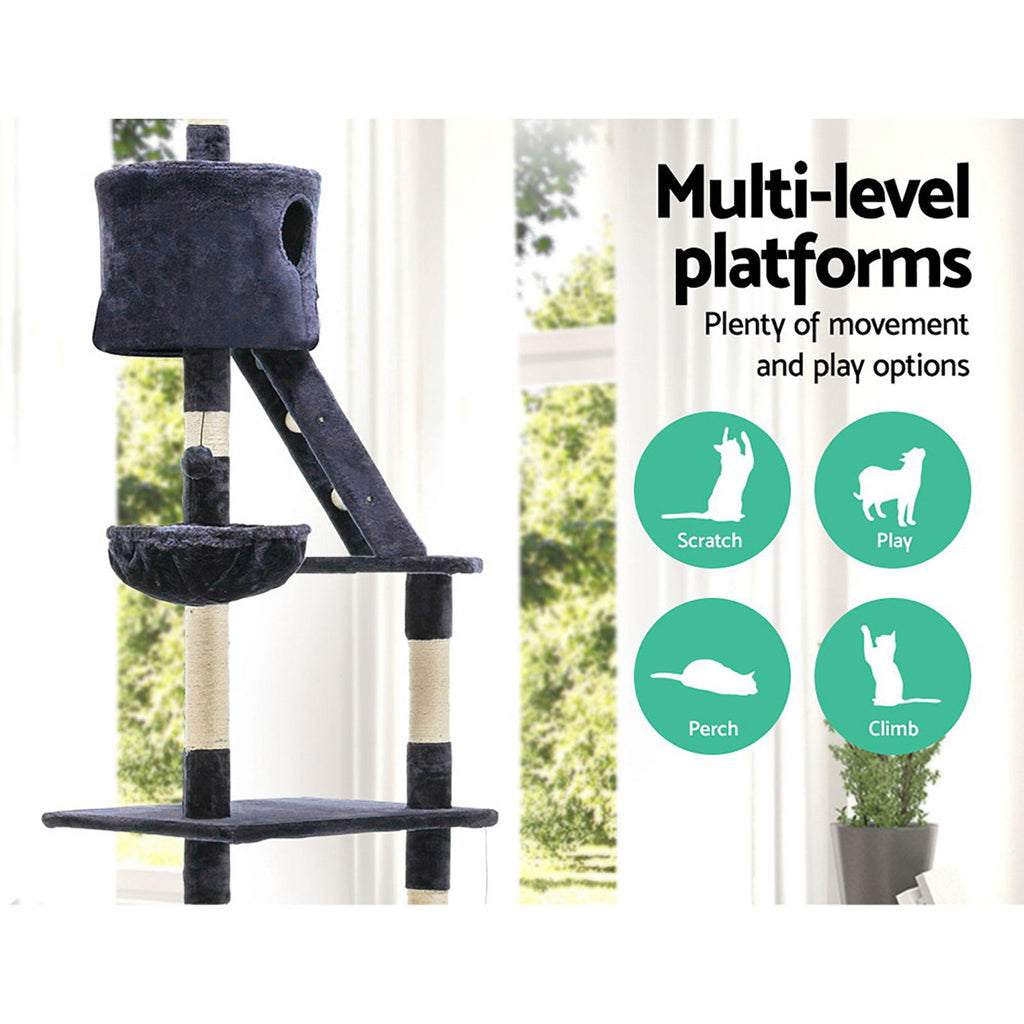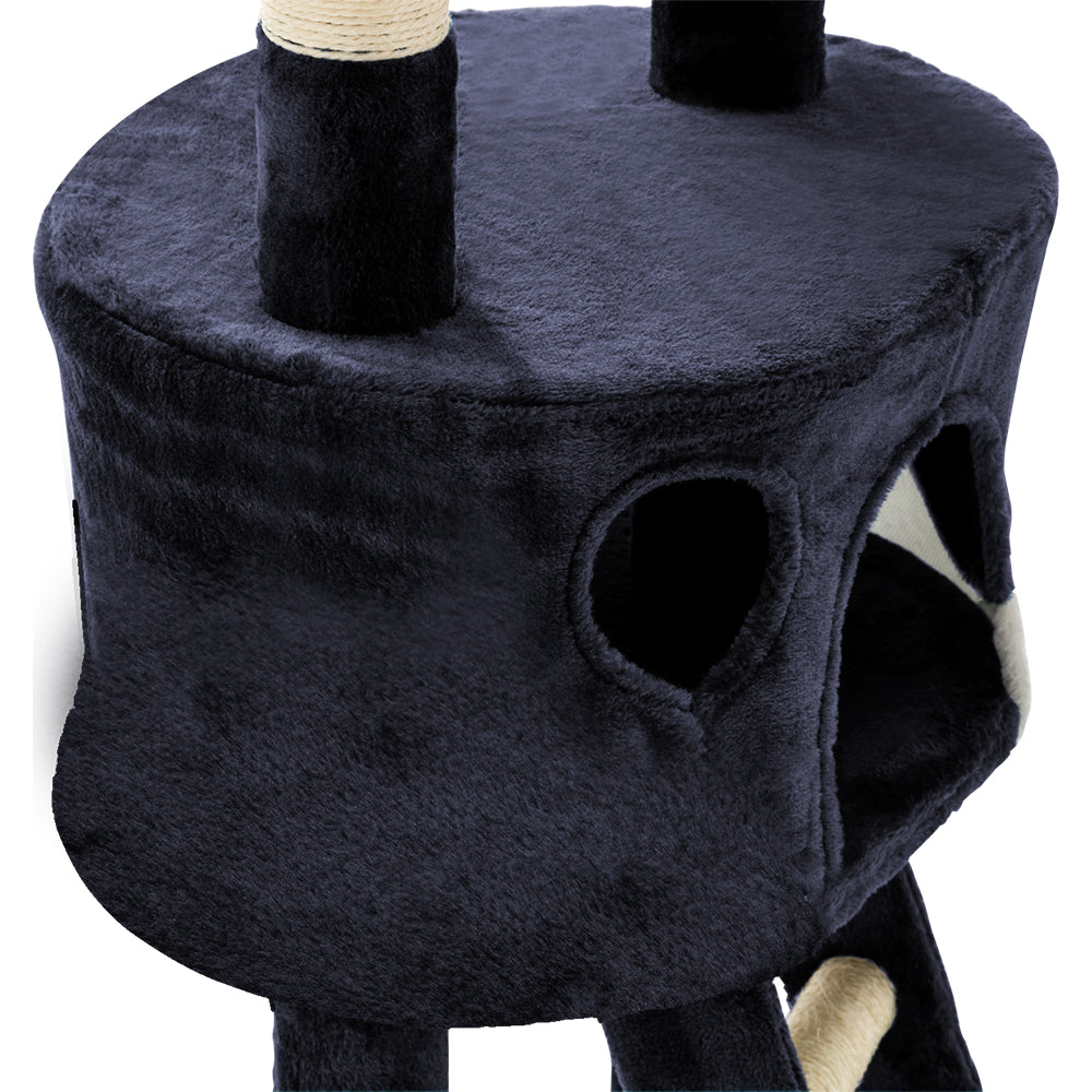 It is absolutely feline wonderland with our cat tree! Built to satisfy the natural instincts of your precious pet, our Cat Tree include a hosts of nooks and crannies for Tom and Tabby to have hours of fun scratching, hunting, climbing, jumping, hopping or simply lounging around. Better still, two hanging balls also help to keep your cat curious and alert at all times. Plus, with its sisal-covered scratching posts, you can rest assured that your furniture will stay cat-free for a very long time. Not least, the tree is upholstered with a plush velvety surface for extra comfort and style. Best of all, the firm base and sturdy construction ensures that the tree remain a durable cat haven with total peace of mind for you. Can we hear a meow to that?