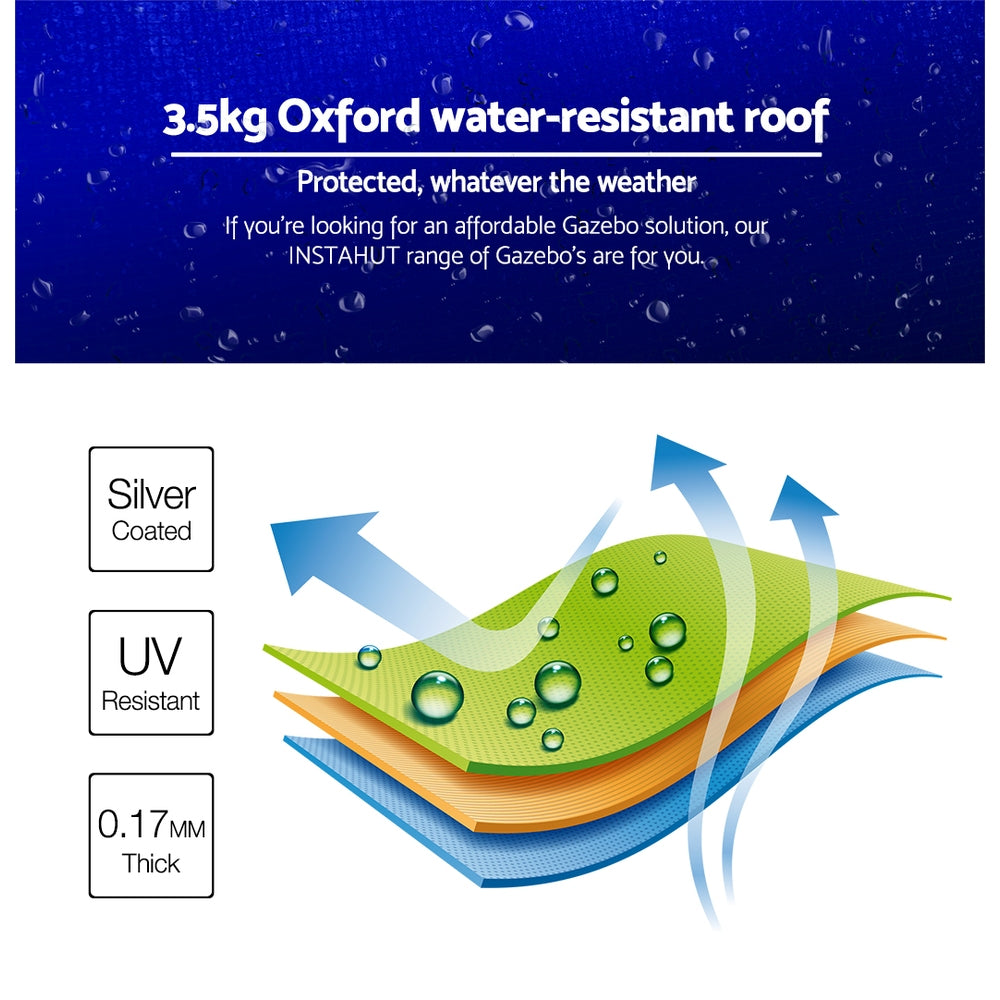 Featuring high density, long lasting silver-coated oxford fabric with effective UV and water repellent treatments, this INSTAHUT 3X3 Pop Up Gazebo provides a lovely ground and canopy coverage of 300 x 300cm. It is perfect for all your upcoming outdoor activities, as a sunshade station as well as a shelter for unexpected rains.
