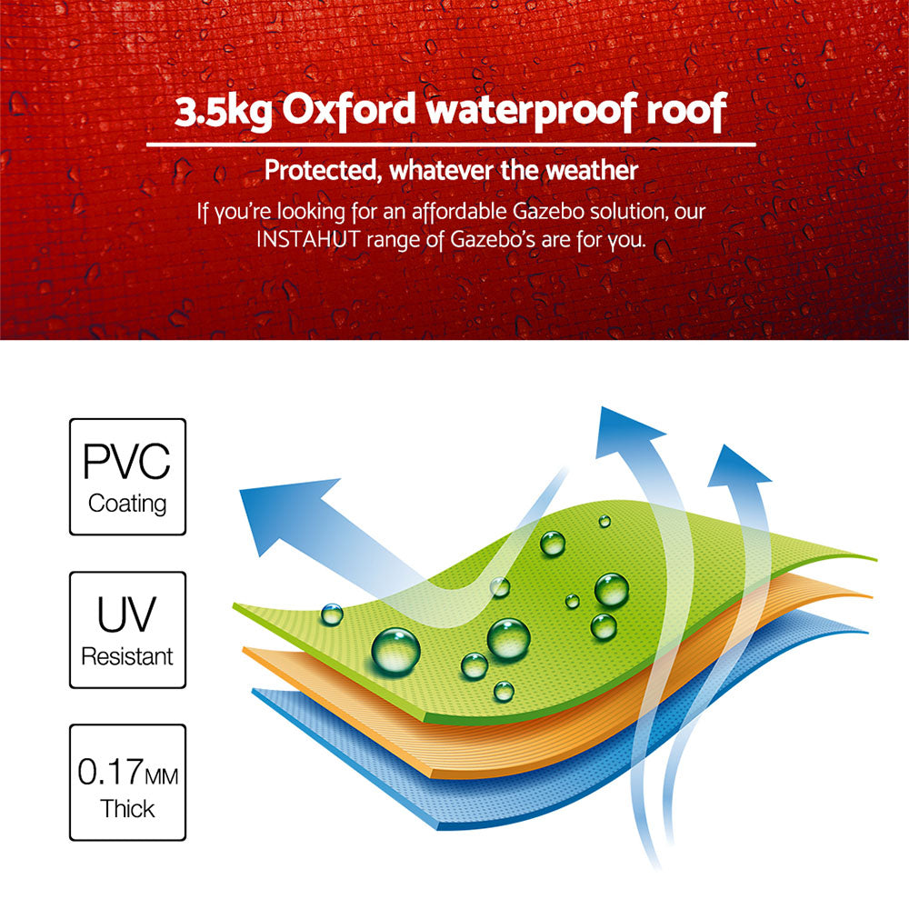 Featuring high density, long lasting PVC coated oxford fabric with effective UV and water repellent treatments, this INSTAHUT 3X3 Pop Up Gazebo provides a lovely ground and canopy coverage of 300 x 300cm. It is perfect for all your upcoming outdoor activities, as a sunshade station as well as a shelter for unexpected rains.