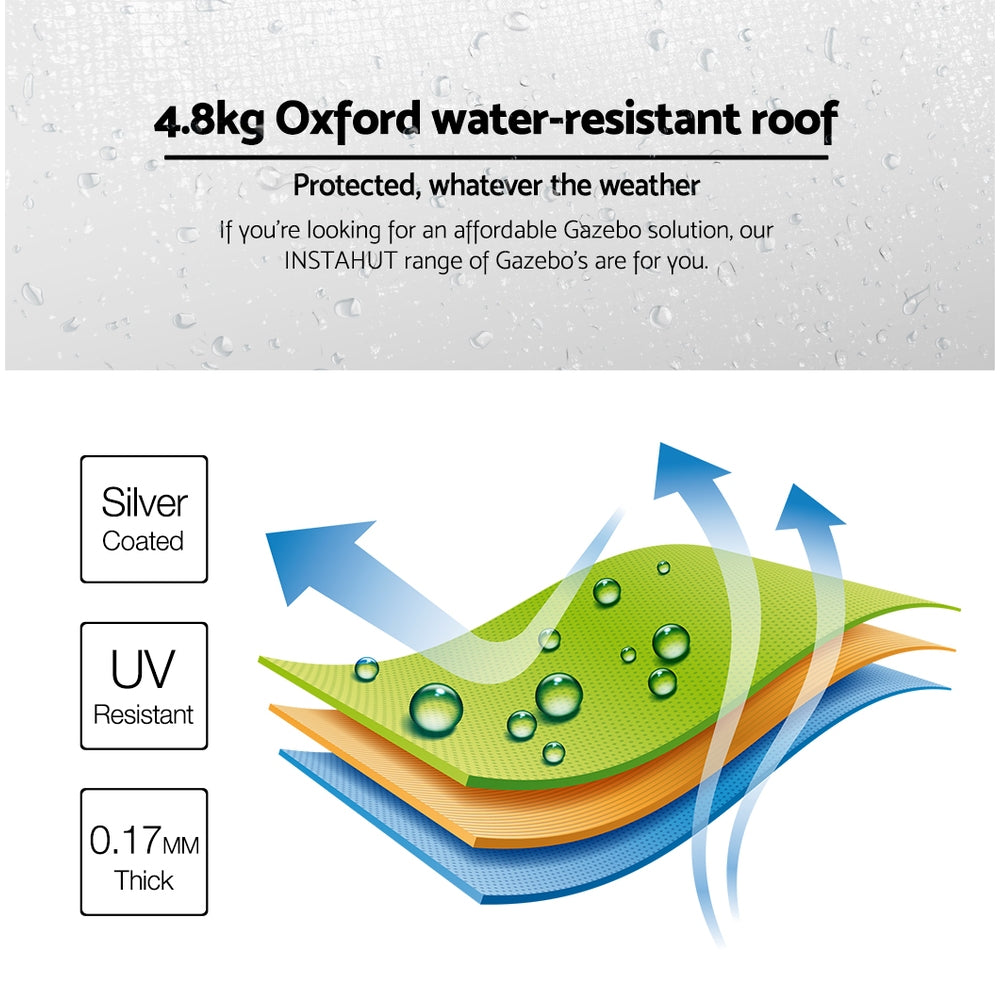 With an extra thick and quick-to-erect powder coated steel frame equipped with strong legs and struts structure, the INSTAHUT gazebo is very simple to set-up and extremely durable. Fitted with quick and convenient velcro attachments, easily release/fasten rings, and smoothly glide on nylon insert for effortless set up, the INSTAHUT gazebo is designed to make things happen instantly!