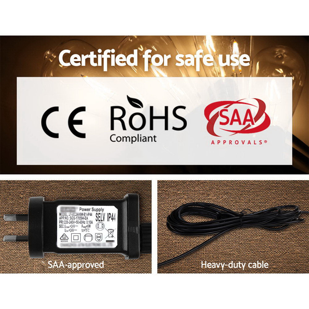 Our Jingle Jollys Festoon String Lights are great not only for wedding and birthday parties or special events, but also for creating a warm, inviting ambience with its bright and mellow glow. Suitable for both indoor and outdoor use, its IP44 rating means that it can be used in the rain and all weather conditions. Each bulb draws a very low voltage and is placed 90cm equally apart from each other throughout its 23m length for an even distribution of illumination and brightness. Not least, the each bulb has a 20,000 hours lifespan so that you can get to use the string lights for quite a while.
