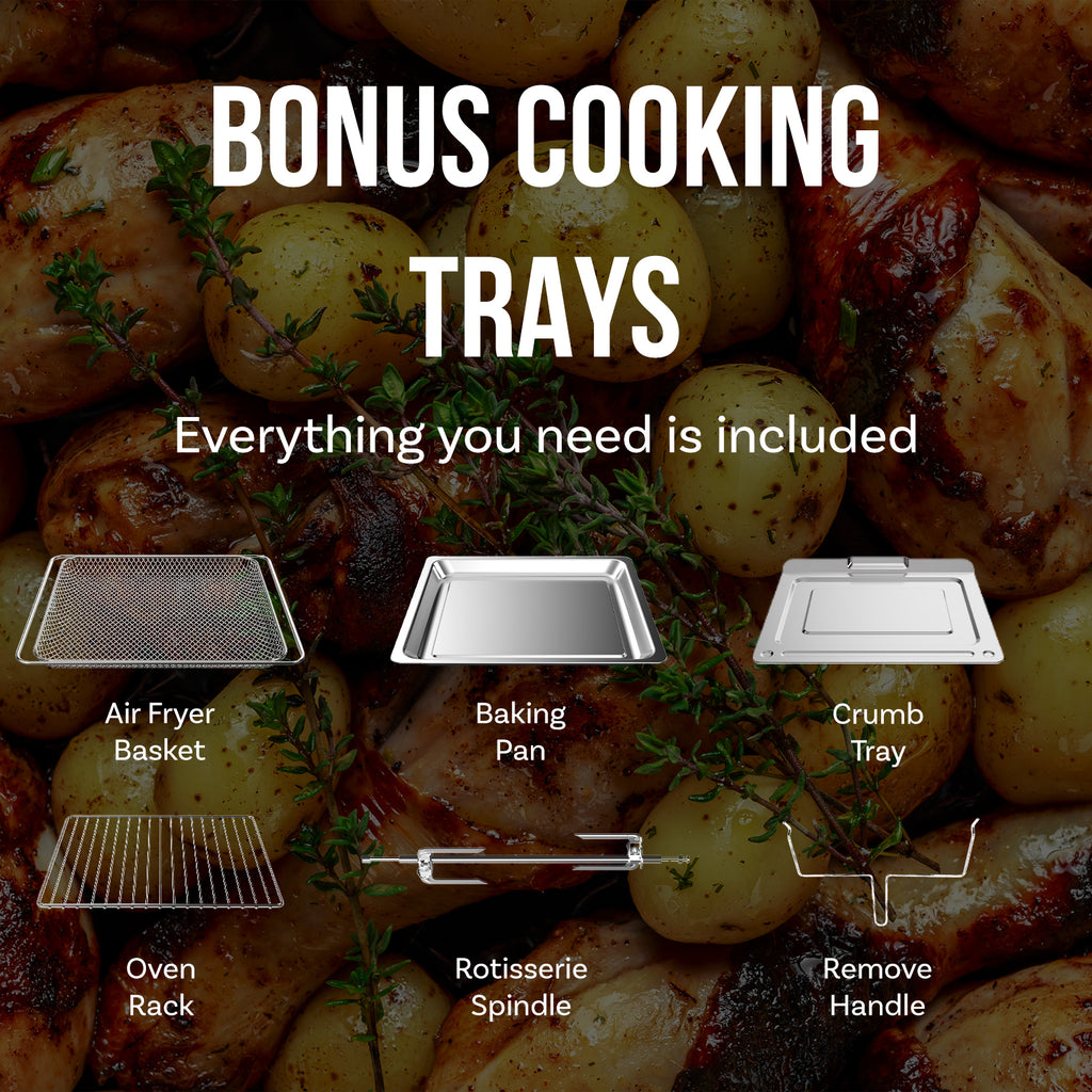 Comes with 6 bonus accessories: Oven rack, baking pan, air fry basket, crumb tray, rotisserie and remove handle