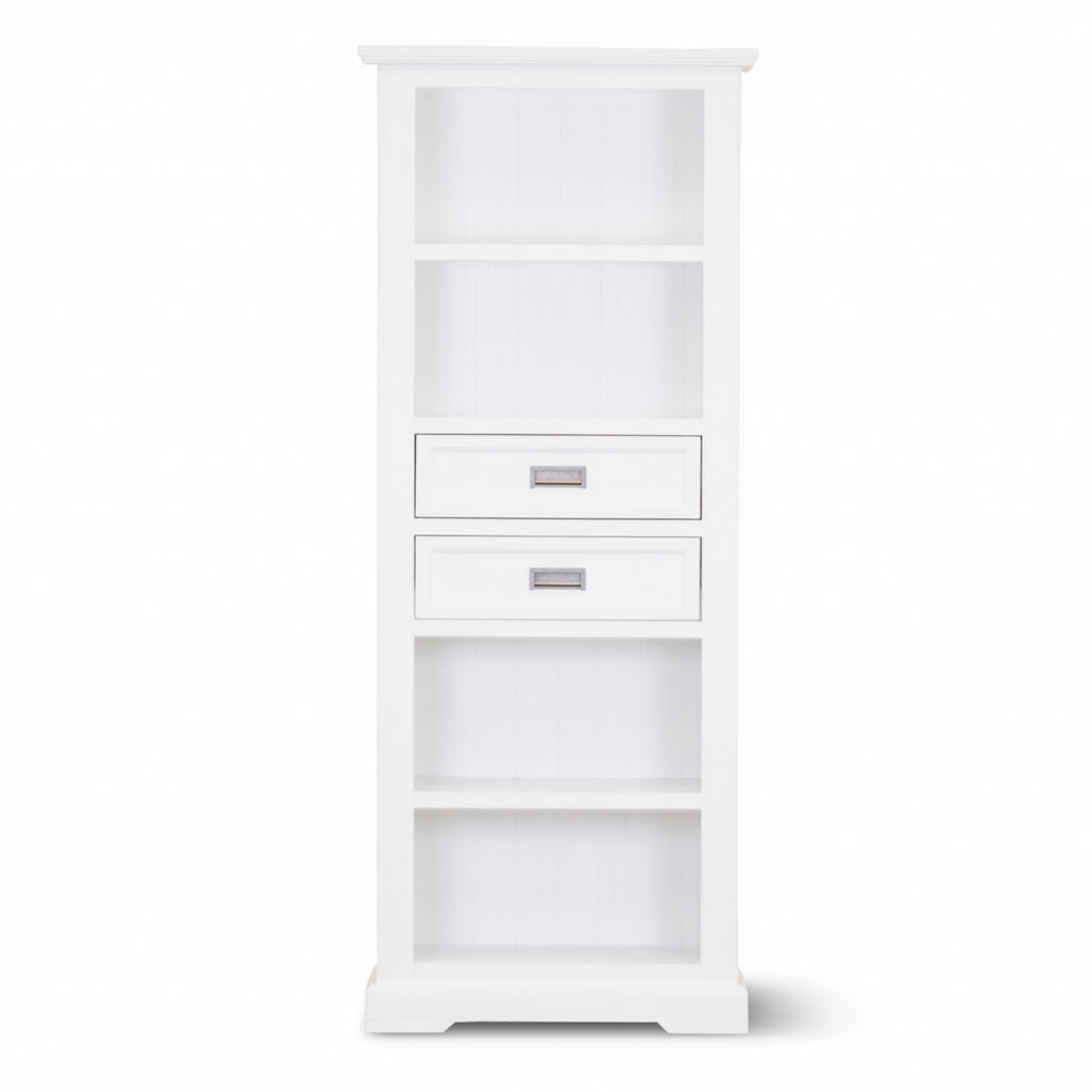 A delightfully useful piece of furniture for book lovers. This sleek and beautifully designed bookcase is composed of sustainably sourced Solid Acacia and MDF. It has 4 large open shelves and 2 drawers with full-extension metal runners. The wood ensures the strength and durability of the bookcase for years to come. The good looking bookcase is angled just at the right places to maximize its clean line aesthetics.Designed in the coastal style, the stunning bookcase features a minimalist, functional, and contemporary design. Due to the vivid white colour, it exudes a serene feel in the atmosphere, which helps in creating a nice ambience in the living area. The bookcase comes with a one-year warranty.