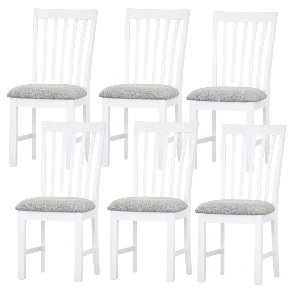 This beautifully designed 6-piece dining chair set is composed of sustainably sourced Solid Acacia and MDF. The wood ensures the strength and durability of the chairs for years to come. The chairs are angled just at the right places to maximize their clean line aesthetics that decorate the dining area brilliantly.Designed in the coastal style, the chairs feature a minimalist, functional, and contemporary design. Due to the vivid white colour, the chairs exude a serene feel in the atmosphere, which helps in creating truly joyful moments with family and friends. The chairs have thick front legs and beautifully tapered back legs. The chair is exceptionally comfortable as its seat is upholstered in 100% polyester fabric. The set of chairs comes with a one-year warranty.