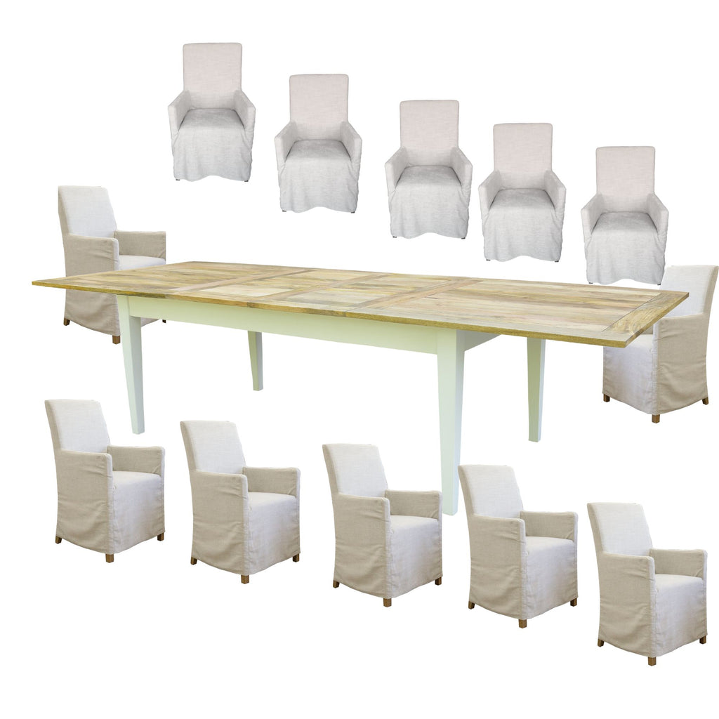 This beautiful dining set gives your living room the perfection it deserves. Both the table and chairs are exceptional in their own ways. Designed beautifully, the multi-coloured table features a lightly stained natural timber tabletop, contrasted with white painted legs. The two-tone range looks gorgeous in a variety of interior decor styles. Designed by using the elements of a combination of styles, including Hampton, Coastal, Modern Farmhouse, and French Provincial, the dining table exudes perfection effortlessly. The big, 12-seater dining table has robust, tapered legs. It is made of sustainably harvested, solid mango wood using traditional construction techniques that ensure perfect cuts and an impeccable shape to suit your taste. The wood makes the table strong and durable while providing water and heat resistance. The dining table is complemented with the beautiful chairs, which feature a simple, functional, substantial design that includes a loose cover with perfect cuts and comfy armrests. The chairs have legs made of rubber wood, giving maximum strength to the chair frame. With a wide seat and a wide backrest, the chair offers maximum relaxation and back support. The chair, in a lovely Beige colour, is made of sustainably harvested solid pine and MDF, and it is upholstered in 100% polyester linen. The easy-to-assemble dining table comes with a one-year warranty, and the fully-assembled chairs come with a two-year warranty.