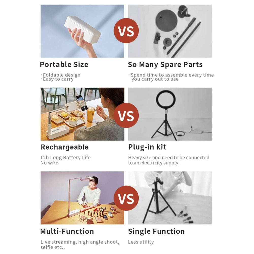-Built-in 1000mAh Battery: This stand is a rechargeable, built-in 1000mAh high-capacity battery, that can work for 3-12 hours after charging. You can carry and keep it anywhere, perfect for outdoor live streams.