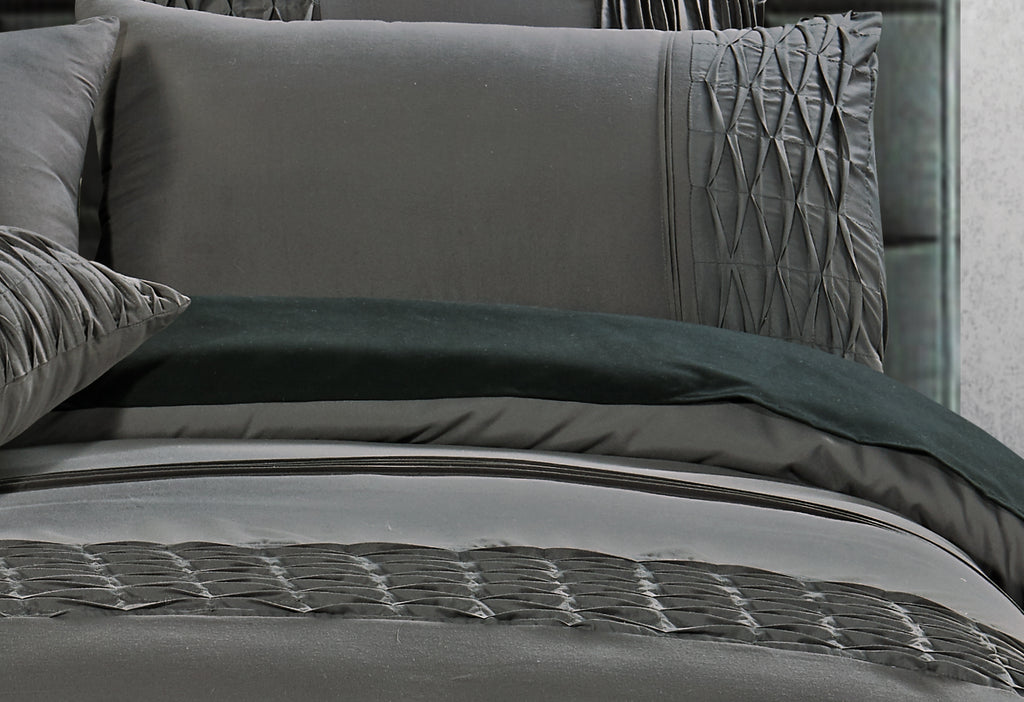 This quilt cover features complex pintucking and weaving.A subtle stone grey colour that is suitable for a wide range of decor is interweaved against the grey pintucking, making this quilt cover suitable for your room. Fabric: microfibre