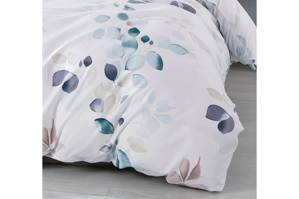Elia quilt cover design for spring and summer with fresh leaf patterns the quilt cover decorates quilt cover and pillowcases with simple garden plant leaf patterns in fresh turquoise blue and teal colors mainly, also mixed with minor purple and dusky pink. Most leaf colors are gradient and become multiple layers from a eye view. It suits modern bedroom which is after fresh colors with netrual white background..