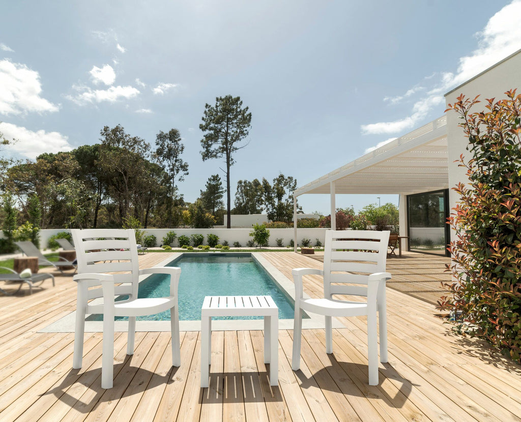 Marina armchair features refinement and a design carefully prepared down to the smallest detail. The horizontal backrest and enhanges this splendid armchair. Practical and functional it has non-skid rubber caps, tubular legs and is stackable.