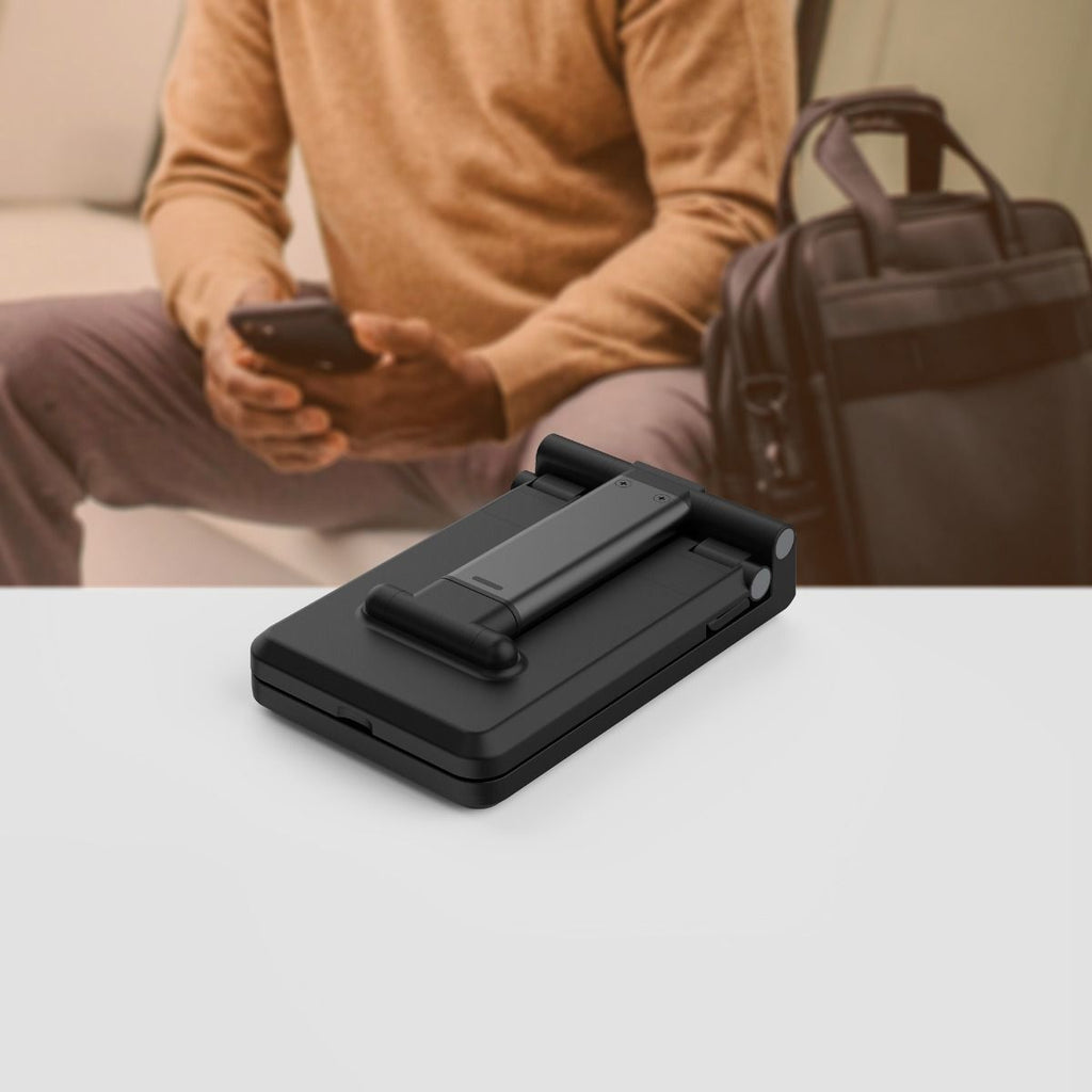 Free your hands from clutching your phone with this sleek mobile phone stand! With a telescopic arm and two points of articulation, adjust the height and angle to get a perfect view of your screen – in landscape or portrait mode – without neck or eye strain! Folds conveniently into pocket-size, it is the ideal phone stand you can take with you! Universally compatible with all major mobile phone models with an opening for charging, the perfect companion for charging, streaming, or video calls on the go!