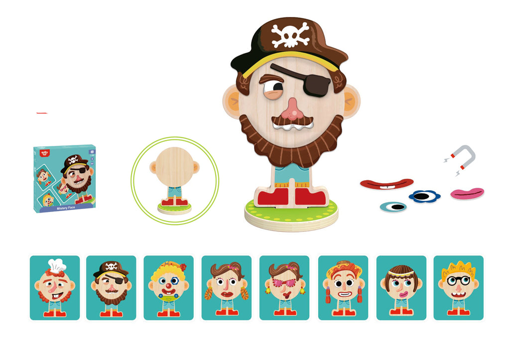 Can you make a funny face? Copy a design from the inspiration cards pr create your own unique character. In this box of funny faces, you will find a wooden head, magnetic features and inspiration cards to copy. By following the simple designs, children learn to follow instruction and problem solving skills. Once they have made the face, they can enjoy some free play and create their own funny faces. With different characters and expressions, children are encouraged to do storytelling as well as understanding expressions and emotions.
