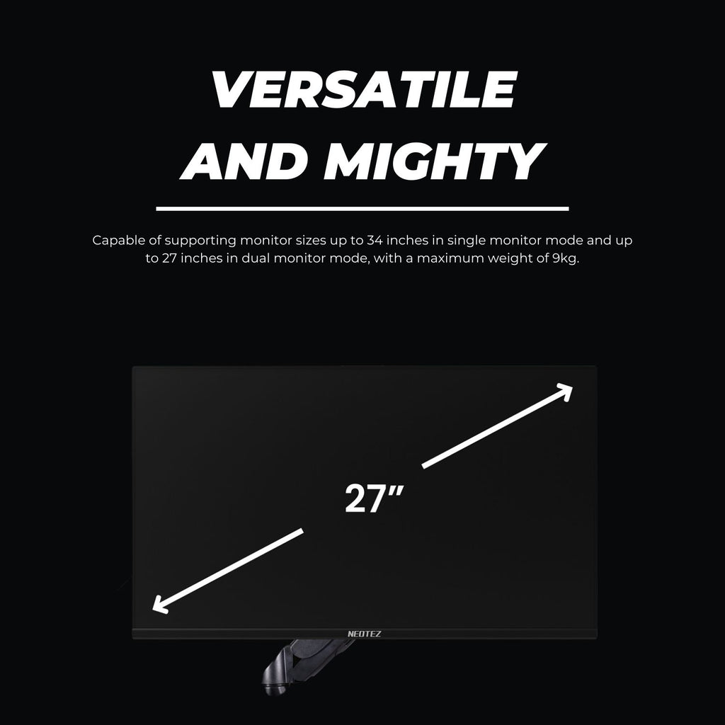 - Capable of supporting monitor sizes up to 34 inches in single monitor mode and up to 27 inches in dual monitor mode, with a maximum weight of 9kg. The SAGITTA PRO DUO also comes with both 75mm x 75mm and 100mm x 100mm mounting options, ensuring compatibility with most monitor mounts.