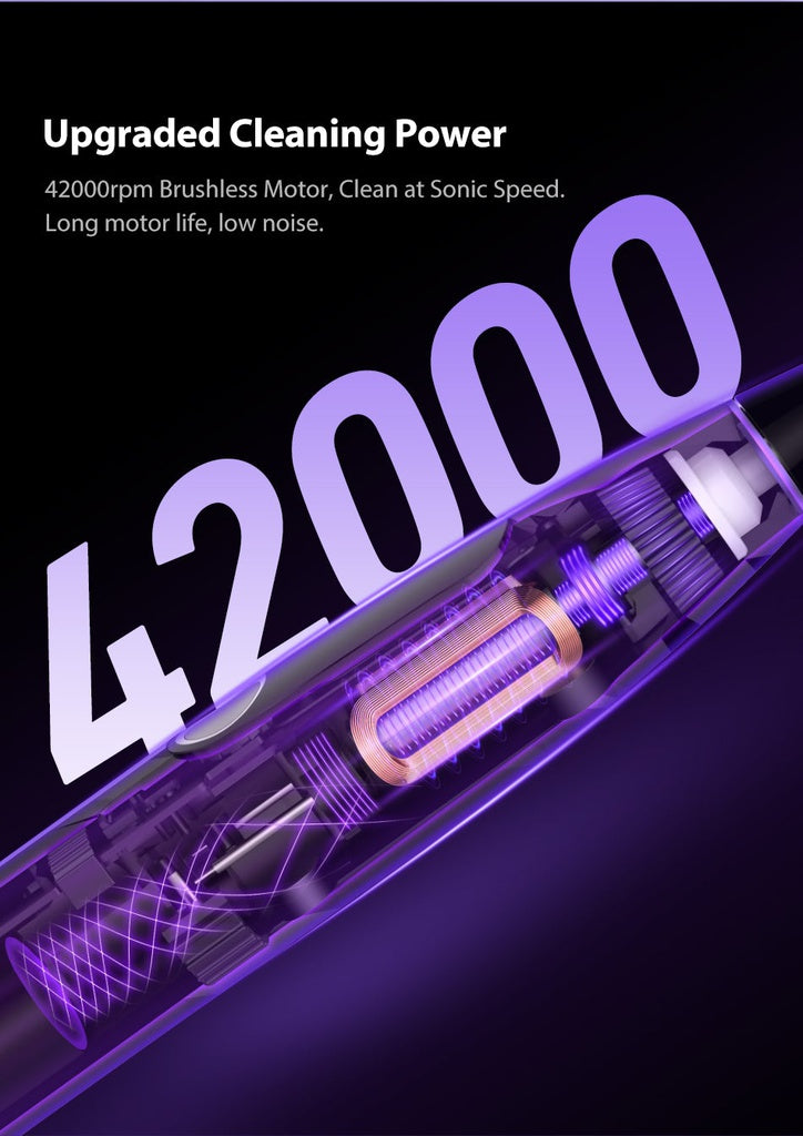 Powered by the new generation Maglev Brushless Motor, Oclean X Pro delivers up to 42,000 brush strokes per minute and maximum 220gf.cm torsion, advanced over other regular electric toothbrushes. Brings powerful and thorough oral cleaning experience.