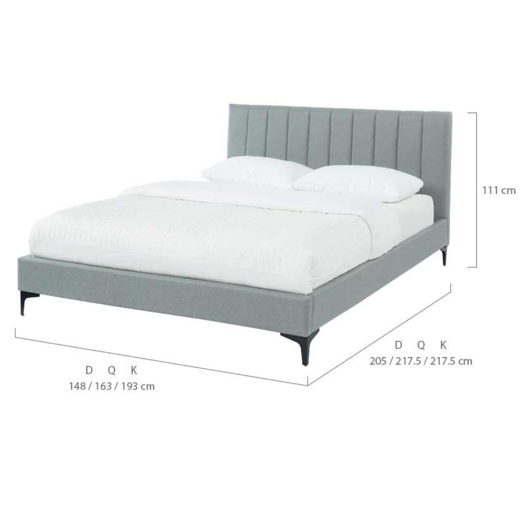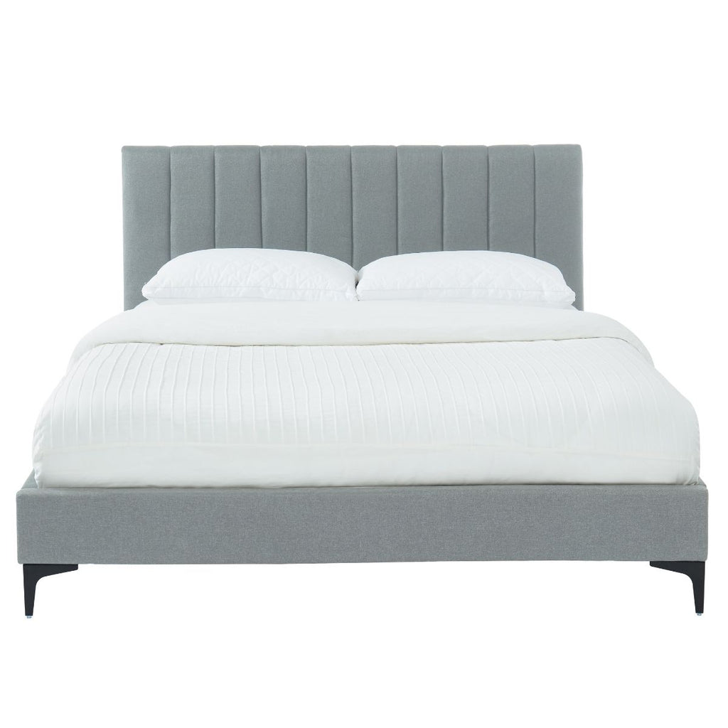The L-shaped designer legs of this bed are finished in a contrasting dark color and perfectly complement its lush grey upholstering.
