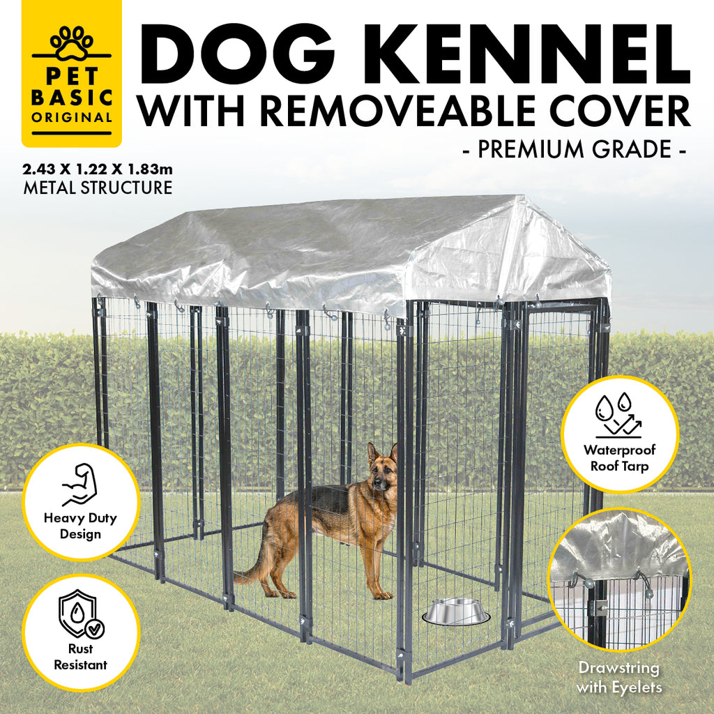 Pet Basic® A premium quality designed dog kennel/enclosure made of strong and durable rust-resistant steel. Featuring a lockable gate and a removable waterproof cover, this is the ideal enclosure for your pets safety, security and comfort.
