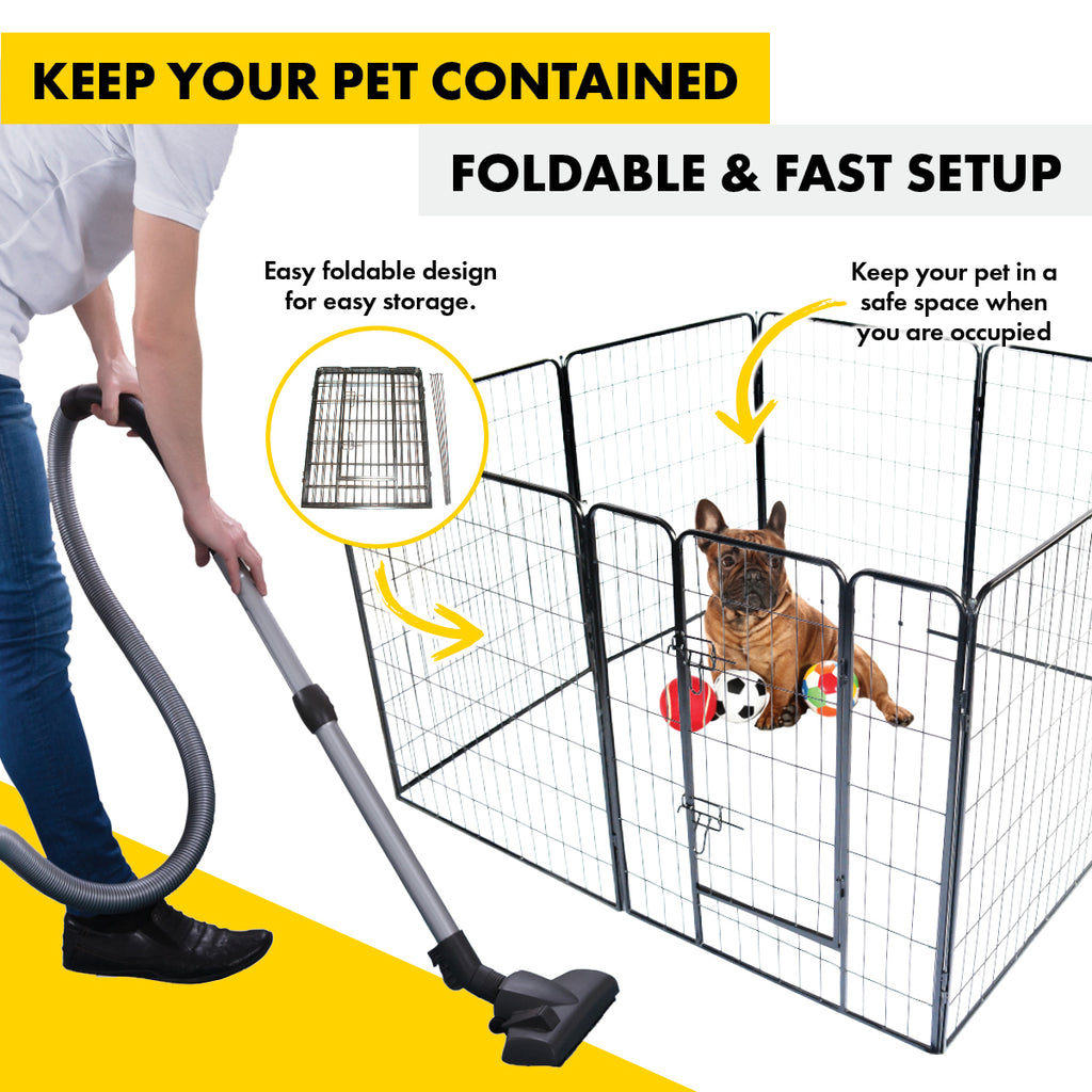 Pet Basic® A multi-configuration designed playpen you can connect and shape as you desire for indoor or outdoor use. Made of strong and durable rust-resistant steel, this playpen has a lockable gate for safety of your pet and giving you peace of mind. The entire pen is foldable for easy transport and storage. The ideal enclosure for your pet to play, exercise and rest in.
