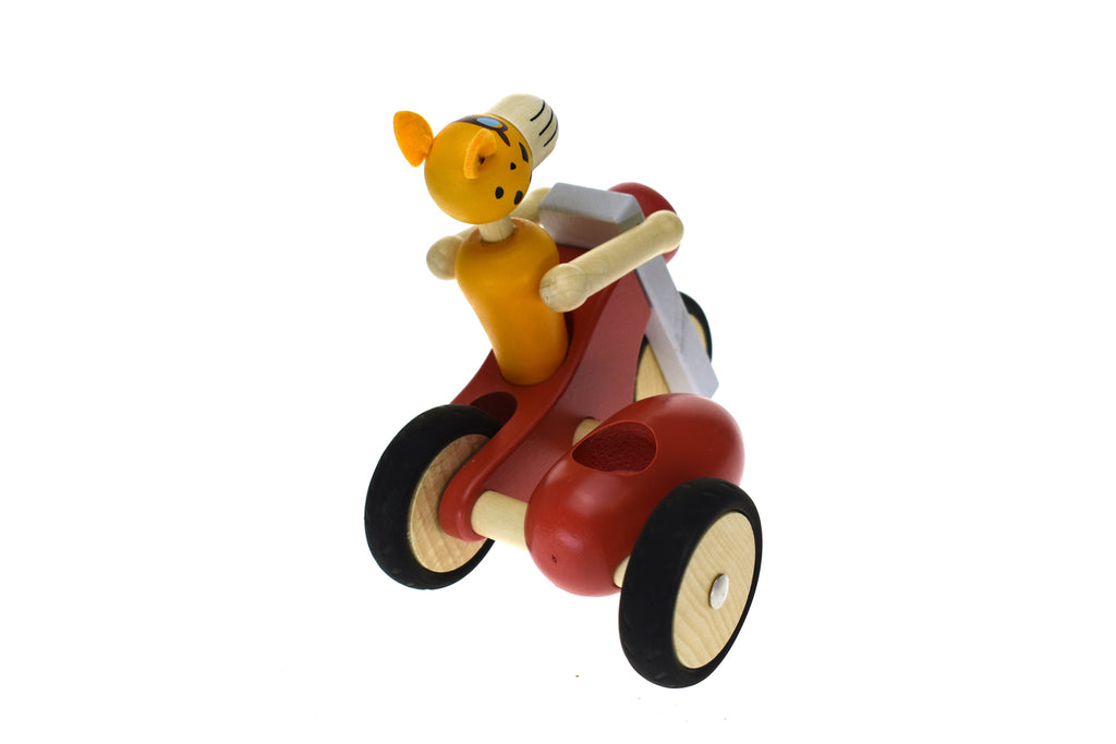 Large, retro styled, wooden motorbike and sidecar with cute leopard driver and rubberised wheels. All set for a tour in the countryside. Beautiful, yet sturdy enough to play with.