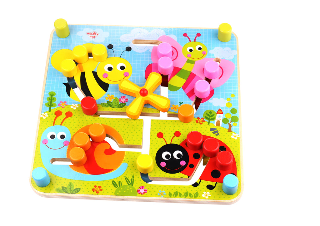 It's a beautiful colourful wooden maze made from quality wood. The bright insect scenes will captivate the young eyes. An interactive maze that may help with hand/eye coordination as kids move the knobs along the track (may also stimulate their motor skills) as they enjoy hours of fun. Once finish on this side flip the maze over and star learning shapes and colours.