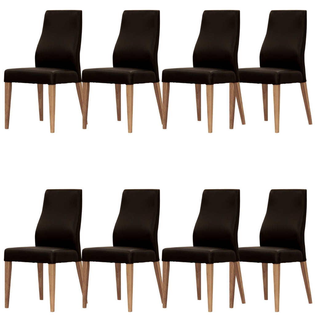 Dining chairs packed with style and substance. This 8-piece set of beautiful chairs features a densely padded seat with an angled backrest. It provides ideal comfort levels and support. The chairs are designed in the Scandinavian-style, featuring innovative wood patterns and colour accents.They look even more beautiful due to their tapered legs and the legs' natural colour with a clear lacquer finish. The gorgeous chairs are upholstered in black PU leather. The chairs are made of sustainably harvested solid messmate and a one-year warranty is included with the fully assembled dining chairs.